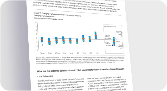 Catalysts for a recovery in emerging market assets Emerging market equities had another very challenging year and disappointed investors’ expectations for this promising high growth asset class. By the end of October, the MSCI Emerging Markets Index had lost 29% in 2022, underperforming developed market equities by 10%. Emerging markets were hit by multiple headwinds, including a sharply slowing global economy, escalating political risks, China’s zero-Covid policy and the fastest Federal Reserve (Fed) tightening cycle in more than three decades. Due to the sharp drop in share prices, equity valuations have fallen across the board. As a result, emerging market equities now look increasingly attractive from a valuation perspective. Our proprietary valuation composite for emerging markets, which includes price-to-earnings, price-to-book and price-to-cash flow ratios, as well as dividend yield, is currently significantly below its long-term average and is also cheap relative to global equities (Exhibit 15). Exhibit 15: Emerging market valuations are increasingly attractive Emerging market valuations Standard deviations from global average 8 ow o inerre hi char 6 Exenie 4 relaie o worl Exenie 2 relaie o own hior€ Crren 0 Chea Aera e -2 relaie o own hior€ Chea -4 relaie o worl -6 Taiwan Brazil S. Africa China Korea EM Mexico ACWI Inia Source: MSCI, Refinitiv Datastream, J.P. Morgan Asset Management. Each valuation index shows an equally weighted composite of four metrics: price to forward earnings (P/E), price to forward book value (P/B), price to forward cash flow (P/CF) and price to forward dividends. Results are then normalised using means and average variability since 2004. The blue bars represent one standard deviation either side of the average relative valuation to the All- Country World index since 2004. Past performance is not a reliable indicator of current and future results. Data as of 31 October 2022. What are the potential catalysts to watch that could help to close this valuation discount in 2023? 1. The Fed pausing The Fed, and the other large central banks in Europe, are Given our base case macro outlook of a modest determined to slow growth to ease inflationary pressures. recession in the US and Europe, and retreating inflation Rising interest rates, increasing energy and input in 2023, we expect the Fed to stop increasing rates early costs, and changing consumer patterns (from goods to in 2023. In such a scenario, cyclical stocks, such as those services) are already slowing down demand for goods in the technology sector, and cyclical markets, such and hampering global manufacturing. North-east Asian as Korea and Taiwan (which have also derated), would markets, with their high export dependency, have been find a much more favourable environment, since equity hit hard in the past couple of quarters as manufacturing markets are usually forward-looking and look ahead to purchasing managers’ indices have fallen and earnings price in an economic recovery. expectations have been revised down. In Taiwan and Korea, the highly significant semiconductor industry was at the centre of the storm as a combination of weakening demand, higher capacity and US restrictions on Chinese exports added to the overall economic headwinds. 12 A bad year for the economy, a better year for markets