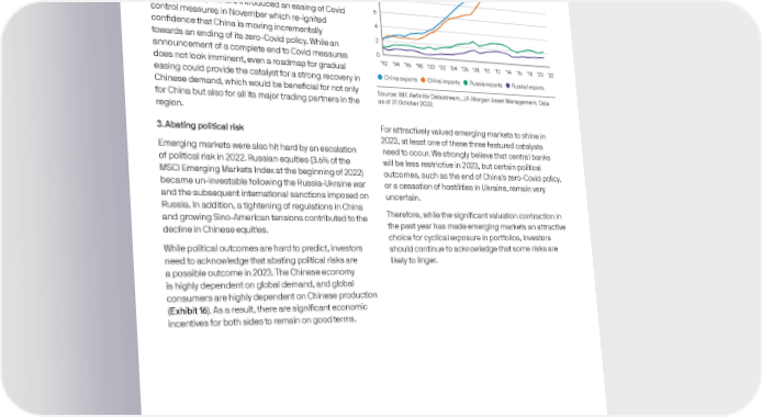 2. The end of the zero-Covid policy in China Exhibit 16: China needs the rest of the world, and vice versa Beijing has stuck to a restrictive lockdown policy through China and Russia’s share of world trade Exports and imports as a % of world total, goods only much of 2022, with serious consequences for economic 16 growth. Consumption growth remains subdued, 14 weighing particularly on the services sector. Meanwhile the struggling property sector has limited room to 12 improve as home buyer sentiment remains depressed by 10 uncertainty over future incomes. 8 However, policymakers introduced an easing of Covid 6 control measures in November which re-ignited 4 confidence that China is moving incrementally 2 towards an ending of its zero-Covid policy. While an announcement of a complete end to Covid measures 0 does not look imminent, even a roadmap for gradual ’92 ’94 ’96 ’98 ’00 ’02 ’04 ’06 ’08 ’10 ’12 ’14 ’16 ’18 ’20 ’22 easing could provide the catalyst for a strong recovery in China exports China imports Russia exports Russia imports Chinese demand, which would be beneficial for not only Source: IMF, Refinitiv Datastream, J.P. Morgan Asset Management. Data for China but also for all its major trading partners in the as of 31 October 2022. region. 3. Abating political risk For attractively valued emerging markets to shine in 2023, at least one of these three featured catalysts Emerging markets were also hit hard by an escalation need to occur. We strongly believe that central banks of political risk in 2022. Russian equities (3.6% of the will be less restrictive in 2023, but certain political MSCI Emerging Markets Index at the beginning of 2022) outcomes, such as the end of China’s zero-Covid policy, became un-investable following the Russia-Ukraine war or a cessation of hostilities in Ukraine, remain very and the subsequent international sanctions imposed on uncertain. Russia. In addition, a tightening of regulations in China Therefore, while the significant valuation contraction in and growing Sino-American tensions contributed to the the past year has made emerging markets an attractive decline in Chinese equities. choice for cyclical exposure in portfolios, investors While political outcomes are hard to predict, investors should continue to acknowledge that some risks are need to acknowledge that abating political risks are likely to linger. a possible outcome in 2023. The Chinese economy is highly dependent on global demand, and global consumers are highly dependent on Chinese production (Exhibit 16). As a result, there are significant economic incentives for both sides to remain on good terms. J.P. Morgan Asset Management 13