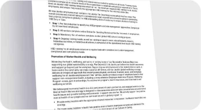 FY21 ESG Disclosures July 2022 Unaudited 46 testing and bespoke crisis training for regional and global crisis management teams, progressing competency and capability. The business utilizes mass communications technologies to support a global response. Worker HSE Training Essential and appropriate HSE training and awareness is provided to workers at all levels. Training needs analysis is completed at relevant levels of the organization to establish competency requirements. This is done via Jacobs’ HSE training categories which set out the minimum required HSE training for all Jacobs employees, and ensure they receive the appropriate HSE training for the role they undertake. All new Jacobs employees must complete the Jacobs’ On-Boarding process which has four steps. This overall process was created taking into consideration legal requirements across the globe in generating best practice compliance globally for HSE onboarding and is mandatory to ensure Jacobs is meeting its HSE Duty of Care. Step 1: Pre-hire induction to specify key HSE programs and risk management approaches. Completed by all new hired employees. Step 2: All workers complete online Global On-Boarding Module within the first week of employment. Step 3: Mandatory that all workers complete Jacobs’ global HSE culture training program. Step 4: Ongoing training needs, as well as training on specific work-related hazards, impacts, hazardous activities, or hazardous situations, is completed at the operational level as per HSE training categories. HSE training for all employees occurs on a regular basis with consideration to risk management, compliance and competency needs. Promotion of Worker Health and Wellbeing Advancing the health, wellbeing, and safety of society is one of our Sustainable Business Objectives supporting our global sustainability strategy, PlanBeyond 2.0. At Jacobs, we believe that health awareness and support go beyond just the workplace. Supporting our employees and other stakeholders at work, at home and in the community can make a positive difference, and our Jacobs’ global wellbeing strategy delivers an integrated approach that encompasses physical, emotional, financial, social, and workplace wellbeing for all Jacobs employees and their families. Jacobs provides a range of employee benefits that support non-occupational health, including a comprehensive Employee Assistance Program, Wellbeing Program access, gym memberships, flu vaccination programs, health insurances, and local health and wellbeing activities. We believe positive mental health is a vital component of a safe, productive, and engaged workforce. Our Mental Health Matters strategy is designed to raise awareness and normalize conversations around mental health issues and provide training and a network to support one another. We actively support the positive mental health of our people and our communities with a global program to: Provide every location with the appropriate trained resources to implement the Mental Health Matters strategy. Empower every location to build their positive mental health champions network and eliminate the stigma of mental health so that is becomes an integral part of our Culture of Caring. As part of the program, we provide Positive Mental Health Champions, training our employees in how to guide staff who have mental health concerns or crises to the appropriate level of help; support fellow employees; and encourage positive mental health throughout the workplace. Jacobs also utilizes its BeyondZero Observation application as part of our continuous improvement efforts to monitor the performance of our mental health programs and to effectively evaluate, monitor, and understand the impact of our mental health programs and overall mental health in the workplace.