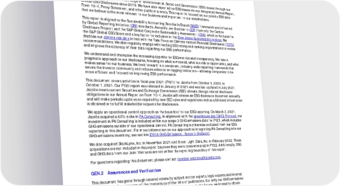 FY21 ESG Disclosures July 2022 Unaudited 5 GENERAL GEN.1 Jacobs ESG Reporting Jacobs has reported on a wide range of Environmental, Social and Governance (ESG) issues through our annual ESG Disclosures since 2019. We have also reported on ESG issues via our Integrated Annual Report, Form 10-K, Proxy Statement, and other public materials. This report is focused on our priority ESG data that we believe is the most relevant to our business and important to our stakeholders. This report is aligned to the Sustainability Accounting Standards Board ( SASB ) framework and informed by Global Reporting Initiative ( GRI ) standards. Annually, we disclose to CDP (formerly the Carbon Disclosure Project) and the S&P Global Corporate Sustainability Assessment, ( CSA ), which is the basis for the S&P Global ESG Score and a key factor for inclusion in the Dow Jones Sustainability Indices . We disclose our climate risk data in line with the Task Force on Climate-related Financial Disclosures ( TCFD ) recommendations. We also regularly engage with leading ESG rating and ranking organizations to review and improve the accuracy of their data regarding our ESG performance. We understand and champion the increasing appetite for ESG metrics and transparency. We take a pragmatic approach to our disclosures, focusing on what is material, what is a risk or opportunity, and what makes sense for our business. We look forward to a consistent, industry-wide reporting framework that serves the investor community and reduces reliance on lagging indicators—allowing companies to be more efficient and focused on improving ESG performance. This document covers activities in fiscal year 2021 (FY21) for Jacobs from October 3, 2020, to October 1, 2021. Our FY20 report was released in January of 2021 and was last updated in July 2021. Jacobs meets current Securities and Exchange Commission (SEC) climate change related disclosure obligations in our Annual Report on Form 10-K. Jacobs will release an ESG disclosure document annually and will make periodic updates as required by new SEC rules and regulations and as additional information is obtained or to fulfill stakeholder requests for disclosures. We apply an operational control approach as the boundary for our ESG reporting. On March 3, 2021, Jacobs acquired a 65% stake in PA Consulting. In alignment with the greenhouse gas (GHG) Protocol, our investment in PA Consulting is included within our scope 3 GHG emissions data for FY21, which includes GHG emissions outside of our operational control. PA Consulting is otherwise excluded from our ESG reporting in this document. For more information on our approach to integrating PA Consulting into our GHG emissions inventory, see section ENV.6 GHG Emissions - Scope 3 (Indirect) . We also acquired BlackLynx, Inc. in November 2021 and Street Light Data, Inc. in February 2022. These acquisitions are not included in this report because they were consummated in FY22. Additionally, ESG and GHG data from our Joint Ventures are not within the reporting boundary of this report. For questions regarding this document, please contact: [email protected] . GEN.2 Assurances and Verification This document has gone through internal review by subject matter experts, legal experts and internal auditors to confirm accuracy of the contents as of the time of publication, but only our GHG emissions data reported here was externally verified, with limited assurance. In the future, we intend to obtain independent assurance of additional data, including social indicators. This document and the data within should be considered unaudited. Certain information reported herein contains estimates or is based on assumptions. Furthermore, forward-looking information in the report, including our goals, plans and expectations, involve risks and uncertainties that may result in our not achieving goals or cause actual results to differ materially from those expressed or implied. Our FY21 Form 10-K (pp. 21–46) contains a discussion of some of the risks and uncertainties that could cause our actual results to differ from our plans and expectations.