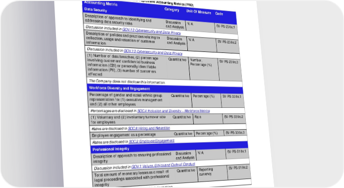 FY21 ESG Disclosures July 2022 Unaudited 67 SUSTAINABILITY ACCOUNTING STANDARDS BOARD (SASB) SASB.1 Professional and Commercial Services (PRO) Table 38. Sustainability Disclosure Topics and Accounting Metrics (PRO) Accounting Metric Category Unit Of Measure Code Data Security Description of approach to identifying and addressing data security risks Discussion and Analysis N/A SV-PS-230a.1 Discussion included in GOV.13 Cybersecurity and Data Privacy Description of policies and practices relating to collection, usage and retention of customer information Discussion and Analysis N/A SV-PS-230a.2 Discussion included in GOV.13 Cybersecurity and Data Privacy (1) Number of data breaches, (2) percentage involving customers' confidential business information (CBI) or personally identifiable information (PII), (3) number of customers affected Quantitative Number, Percentage (%) SV-PS-230a.3 The Company does not disclose this information. Workforce Diversity and Engagement Percentage of gender and racial/ethnic group representation for (1) executive management and (2) all other employees Quantitative Percentage (%) SV-PS-330a.1 Percentages are disclosed in SOC.4 Inclusion and Diversity – Workforce Metrics (1) Voluntary and (2) involuntary turnover rate for employees Quantitative Rate SV-PS-330a.2 Rates are disclosed in SOC.8 Hiring and Retention Employee engagement as a percentage Quantitative Percentage (%) SV-PS-330a.3 Rates are disclosed in SOC.2 Employee Engagement Professional Integrity Description of approach to ensuring professional integrity Discussion and Analysis N/A SV-PS-510a.1 Discussion included in GOV.1 Values, Ethics and Code of Conduct Total amount of monetary losses as a result of legal proceedings associated with professional integrity Quantitative Reporting currency SV-PS-510a.2 The Company does not disclose this information.
