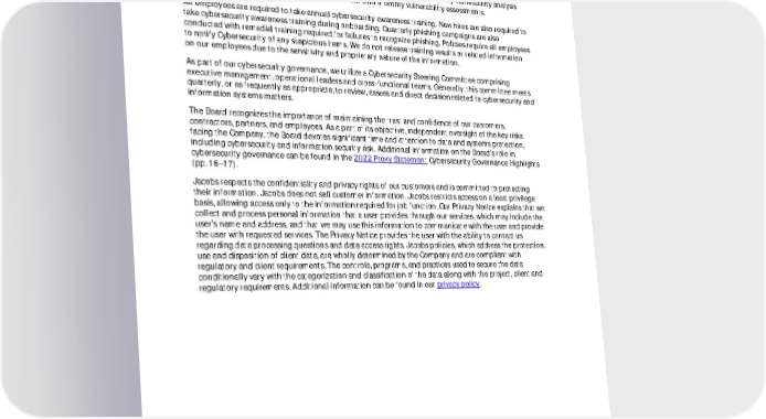 FY21 ESG Disclosures July 2022 Unaudited 66 monitoring, testing and reporting; operational and incident response and reporting; and training and awareness. To validate the effectiveness of our systems at least annually we conduct tests of our business continuity, contingency plans and incident response procedures. We also conduct third-party vulnerability analysis including simulated hacker attacks and conduct our own monthly vulnerability assessments. All employees are required to take annual cybersecurity awareness training. New hires are also required to take cybersecurity awareness training during onboarding. Quarterly phishing campaigns are also conducted with remedial training required for failures to recognize phishing. Policies require all employees to notify Cybersecurity of any suspicious items. We do not release training results or related information on our employees due to the sensitivity and proprietary nature of the information. As part of our cybersecurity governance, we utilize a Cybersecurity Steering Committee comprising executive management, operational leaders and cross-functional teams. Generally, this committee meets quarterly, or as frequently as appropriate, to review, assess and direct decision related to cybersecurity and information systems matters. The Board recognizes the importance of maintaining the trust and confidence of our customers, contractors, partners, and employees. As a part of its objective, independent oversight of the key risks facing the Company, the Board devotes significant time and attention to data and systems protection, including cybersecurity and information security risk. Additional information on the Board’s role in cybersecurity governance can be found in the 2022 Proxy Statement Cybersecurity Governance Highlights (pp. 16–17). Jacobs respects the confidentiality and privacy rights of our customers and is committed to protecting their information. Jacobs does not sell customer information. Jacobs restricts access on a least privilege basis, allowing access only to the information required for job function. Our Privacy Notice explains that we collect and process personal information that a user provides through our services, which may include the user’s name and address, and that we may use this information to communicate with the user and provide the user with requested services. The Privacy Notice provides the user with the ability to contact us regarding data processing questions and data access rights. Jacobs policies, which address the protection, use and disposition of client data, are wholly determined by the Company and are compliant with regulatory and client requirements. The controls, programs, and practices used to secure the data conditionally vary with the categorization and classification of the data along with the project, client and regulatory requirements. Additional information can be found in our privacy policy .