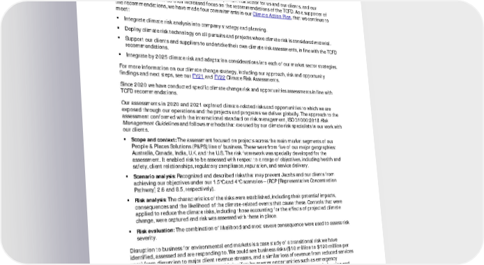 FY21 ESG Disclosures July 2022 Unaudited 19 to all employees to help them understand the role they can play in climate change action and continue to develop the critical green skills and solutions needed for our continually evolving world. Climate Risk and the Taskforce on Climate-related Financial Disclosures (TCFD) Climate risk and resilience pose an urgent and important risk factor for us and our clients, and our investors have confirmed their increased focus on the recommendations of the TCFD. As a supporter of the recommendations, we have made four commitments in our Climate Action Plan , that we continue to meet: Integrate climate risk analysis into company strategy and planning. Deploy climate risk technology on all pursuits and projects where climate risk is considered material. Support our clients and suppliers to undertake their own climate risk assessments, in line with the TCFD recommendations. Integrate by 2025 climate risk and adaptation considerations into each of our market sector strategies. For more information on our climate change strategy, including our approach, risk and opportunity findings and next steps, see our FY21 and FY22 Climate Risk Assessments. Since 2020 we have conducted specific climate change risk and opportunities assessments in line with TCFD recommendations. Our assessments in 2020 and 2021 explored climate-related risks and opportunities to which we are exposed through our operations and the projects and programs we deliver globally. The approach to the assessment conformed with the international standard on risk management, ISO 31000:2018 Risk Management Guidelines and follows methods that are used by our climate risk specialists in our work with our clients. Scope and context: The assessment focused on projects across the main market segments of our People & Places Solutions (P&PS) line of business. These were from five of our major geographies: Australia, Canada, India, U.K. and the U.S. The risk framework was specially developed for the assessment. It enabled risk to be assessed with respect to a range of objectives, including health and safety, client relationships, regulatory compliance, reputation, and service delivery. Scenario analysis: Recognized and described risks that may prevent Jacobs and our clients from achieving our objectives under our 1.5°C and 4°C scenarios – (RCP [Representative Concentration Pathway] 2.6 and 8.5, respectively). Risk analysis: The characteristics of the risks were established, including their potential impacts, consequences and the likelihood of the climate-related events that cause these. Controls that were applied to reduce the climate risks, including those accounting for the effects of projected climate change, were captured and risk was assessed with these in place. Risk evaluation: The combination of likelihood and most severe consequence were used to assess risk severity. Disruption to business for environmental end markets is a case study of a transitional risk we have identified, assessed and are responding to. We could see business risks ($10 million to $100 million per year) from disruption to major client revenue streams, and a similar loss of revenue from reduced services for fossil fuel related projects. However, this is offset by greater opportunities such as emergency management and national security ($10 million to $100 million per year), environmental planning and permitting for extreme weather impacts ($10 million to $100 million per year) and civil works including circular economy, waste management, clean energy and natural treatment systems ($10 million to $100 million per year). Analyzing our markets revealed common themes and specific insights allowing us to estimate the value of financial impacts to Jacobs.