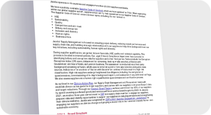 FY21 ESG Disclosures July 2022 Unaudited 53 department and internal audit regarding hotline reports (to the extent not reported to another committee). More information can be found on our website here: Ethics & Conduct . GOV.2 Supply Chain Jacobs operates in 40 countries and engages more than 20,000 suppliers worldwide. We have a publicly-available Supplier Code of Conduct , which we have updated for FY22. When registering within our global supplier system, suppliers must certify their agreement to our Supplier Code of Conduct. The Supplier Code of Contact covers various topics, including, but not limited to: HSE Sustainability Quality Competition and anti-trust Bribery and corruption Inclusion and diversity Human rights Business ethics Jacobs’ Supply Management is focused on ensuring project delivery, reducing overall performance and supply chain risk, and building strategic relationships with our suppliers to help drive savings and meet our key initiatives, including sustainability, human rights and diversity. During supplier qualification, we gather data on financials, HSE, quality and technical capability. This process is detailed in internal policies. Our Legal Ethics & Compliance department has a process for identifying bribery and corruption risks for suppliers and other third parties. Factors include the Corruption Perception Index (CPI) score, debarment list screening, desktop media searches, affiliation with Government entities/officials, and years in business. The assessment is conducted via a third-party background screening software, which uses external data points from sanctions lists and public news sources. Indicators of interaction/affiliation with Government entities/officials result in a high-risk classification. High risk suppliers undergo heightened due diligence, including the completion of questionnaires, commissioning of in-depth background reports, and evaluation of any additional red flags. We also assess suppliers via a human rights qualification questionnaire and certification process. As outlined in our Climate Action Plan , our Supply Chain Management and Procurement teams will establish climate action goals for major suppliers, and partner with our suppliers to improve Scope 3 data and target reductions. Through our Science-Based Targets we have committed that 65% of our suppliers by spend covering purchased goods and services will have science based targets by 2025. In January 2021, we made a three-year commitment to CDP as a supply chain member to engage our suppliers, pinpoint risks and identify opportunities to support our suppliers in reducing emissions and strengthening their climate resiliency. Jacobs was recognized on CDP’s 2021 Supplier Engagement Leaderboard for engaging our suppliers on climate change and playing a crucial role in the transition towards the net-zero sustainable economy. GOV.3 Board Structure Jacobs maintains information on Corporate Governance, including information on our Board, on our Investors’ website invest.jacobs.com . Also, refer to our 2022 Proxy Statement for details on our governance structure. The Board’s leadership is comprised of Chair of the Board and CEO, Steven J. Demetriou, and Lead Independent Director, Christopher M.T. Thompson. The Board has determined that having Mr. Demetriou serve as Chair of the Board provides significant advantages to the Board and the Company, as it allows the Board to benefit from his knowledge of the Company’s business and market opportunities and risks, and