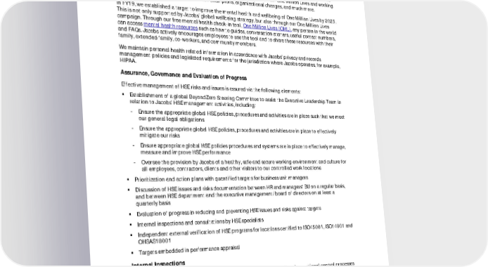 FY21 ESG Disclosures July 2022 Unaudited 47 By using the BeyondZero Observation application and selecting Mental Health, Jacobs employees can engage with us on all our mental health programs—both what we’re doing well and where they see opportunities for improvement. Employees can select the relevant topic(s), without divulging detailed information. The Mental Health BeyondZero Observation provides an easy way for employees to provide quantitative feedback on the matters that impact their mental health, from One Million Lives and working from home, to our Positive Mental Health Champions, organizational changes, and much more. In FY19, we established a target to improve the mental health and wellbeing of One Million Lives by 2025. This is not only supported by Jacobs’ global wellbeing strategy, but also through our One Million Lives campaign. Through our free mental health check-in tool, One Million Lives (OML), any person in the world can access mental health resources such as how to guides, conversation starters, useful contact numbers, and FAQs. Jacobs actively encourages employees to use the tool and to share these resources with their family, extended family, co-workers, and community members. We maintain personal health related information in accordance with Jacobs’ privacy and records management policies and legislated requirements for the jurisdiction where Jacobs operates, for example, HIPAA. Assurance, Governance and Evaluation of Progress Effective management of HSE risks and issues is assured via the following elements: Establishment of a global BeyondZero Steering Committee to assist the Executive Leadership Team in relation to Jacobs’ HSE management activities, including: - Ensure the appropriate global HSE policies, procedures and activities are in place such that we meet our general legal obligations - Ensure the appropriate global HSE policies, procedures and activities are in place to effectively mitigate our risks - Ensure appropriate global HSE policies procedures and systems are in place to effectively manage, measure and improve HSE performance - Oversee the provision by Jacobs of a healthy, safe and secure working environment and culture for all employees, contractors, clients and other visitors to our controlled work locations Prioritization and action plans with quantified targets for business unit managers Discussion of HSE issues and risks documentation between HR and managers' BU on a regular basis, and between HSE department and the executive management/board of directors on at least a quarterly basis Evaluation of progress in reducing and preventing HSE issues and risks against targets Internal inspections and consultations by HSE specialists Independent external verification of HSE programs for locations certified to ISO45001, ISO14001 and OHSAS18001 Targets embedded in performance appraisal Internal Inspections Internal inspections are integrated into Jacobs’ HSE risk management and operational control processes to verify the effectiveness of controls and identify improvement opportunities. Operational management plans outline inspection and monitoring requirements, as do Safe Systems of Work at the activity level. Inspections in the form of ongoing monitoring occur through Jacobs’ BeyondZero Observations. This is a process used by all employees to intervene and report on work behaviors and conditions inclusive of all HSE and Security risks and opportunities. The process includes response, notification and action management.