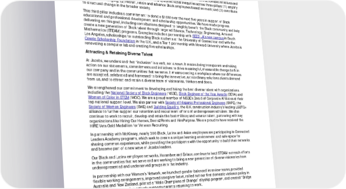 FY21 ESG Disclosures July 2022 Unaudited 29 Action Plan for Advancing Justice & Equality Our focus on creating equal opportunities within Jacobs, including among historically underrepresented groups, continues to increase as we deliver on the promises laid out in last year’s global Action Plan for Advancing Justice and Equality . In alignment with TogetherBeyond, this plan sets actionable initiatives and measurable objectives to address embedded and systemic racial inequities across three pillars: (1) amplify a culture of belonging; (2) recruit, retain and advance Black employees based on merit; and (3) contribute to structural change in the broader society. This third pillar includes a commitment to donate $10M over the next five years in support of Black educational and professional development and scholarship opportunities. We have made progress delivering on this goal, including contributions designed to tangibly benefit the Black community and help create a new generation of Black talent through targeted Science, Technology, Engineering, Arts and Mathematics (STEAM) programs. Examples include a partnership with SEED LA’s new campus in South Los Angeles, scholarships for outstanding Black students at the University of Connecticut and with the Cowrie Scholarship Foundation in the U.K., and a Tier 1 partnership with Howard University where Jacobs is renovating a computer lab and creating five scholarships. Attracting & Retaining Diverse Talent At Jacobs, we understand that “inclusion” is a verb, not a noun. It means being transparent and taking action on our statements, commitments and initiatives to drive meaningful, measurable change both in our company and in the communities that we serve. It means creating a workplace where our differences are accepted, celebrated and harnessed to bring the innovative, extraordinary solutions clients demand from us, and to attract and retain a diverse team of visionaries, thinkers and doers. We strengthened our commitment to developing and hiring the best diverse talent with organizations including the National Society of Black Engineers (NSBE), Black Engineer of the Year Awards (BEYA) and Women of Color in STEM (WOC). We are a proud member of NSBE’s Board of Corporate Affiliates at their top national support level. We also partner with Society of Hispanic Professional Engineers (SHPE), the Society of Women Engineers (SWE) and Building Equality , the U.K. construction industry’s leading LGBTQ+ alliance to further support our retention and recruitment efforts of underrepresented talent. We also continue to work to recruit, develop and retain the best military and veteran talent, partnering with key organizations like Hiring Our Heroes, Boots2Roots and HirePurpose. We are proud to have received the HIRE Vets Gold Medallion for Veteran Recruiting. In partnership with McKinsey, nearly 300 Black, Latinx and Asian employees are participating in Connected Leaders Academy programs, which seek to create a unique learning environment and safe space for sharing common experiences, while providing the participants with the opportunity to build their networks and become part of a new wave of Jacobs leaders. Our Black and Latinx employee networks, Harambee and Enlace, continue to lead STEAM outreach efforts in the communities that we serve and are working to bring a new generation of diverse visionaries from underrepresented and underserved groups into the industry. In partnership with our Women’s Network, we launched gender-balanced interview teams, provided flexible working arrangements, improved caregiver leave, rolled out our first domestic violence policy in Australia and New Zealand, piloted a “Male Champions of Change” allyship program, and created “Bridge the Gap,” a program that actively supports parents returning to work. In addition to the above, we promote an inclusive environment for our diverse workforce via many approaches, including: Offering Conscious Inclusion and Advocate & Ally training for all employees Incorporating inclusion as a key focus area in leadership development programs Investing in diversity recruitment