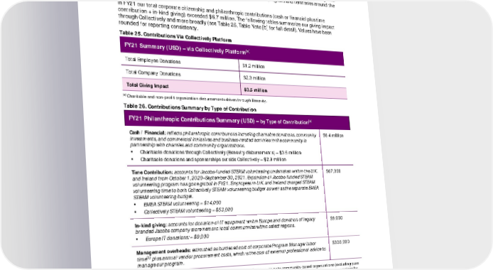 FY21 ESG Disclosures July 2022 Unaudited 39 In FY21 we introduced paid volunteering time for STEAM education outreach activities world-wide, up to an annual user time cap. We also partnered with the Society for Science to serve as the champion of the Environmental Engineering category at the Society’s annual International Science and Engineering Fair (ISEF). ISEF is a premier pre-collegiate competition and talent pipeline that fosters the best and brightest minds through more than 400 affiliated science fairs in 80+ countries, regions and territories around the world. In FY21 our total corporate citizenship and philanthropic contributions (cash or financial plus time contribution + in-kind giving) exceeded $6.7 million. The following tables summarize our giving impact through Collectively and more broadly (see Table 25, Table Note [b] for full detail). Values have been rounded for reporting consistency. Table 25. Contributions Via Collectively Platform FY21 Summary (USD) – via Collectively Platform [a] Total Employee Donations $1.2 million Total Company Donations $2.3 million Total Giving Impact $3.5 million [a] Charitable and non-profit organization disbursements driven through Benevity. Table 26. Contributions Summary by Type of Contribution FY21 Philanthropic Contributions Summary (USD) – by Type of Contribution [a] Cash / Financial: reflects philanthropic contributions including charitable donations, community investments, and commercial initiatives and business-related activities in the community in partnership with charities and community organizations. Charitable donations through Collectively (Benevity disbursements) = $3.5 million Charitable donations and sponsorships outside Collectively = $2.9 million $6.4 million Time Contribution: accounts for Jacobs-funded STEAM volunteering undertaken within the U.K. and Ireland from October 1, 2020–September 30, 2021. Expansion of Jacobs-funded STEAM volunteering program has gone global in FY21. Employees in U.K. and Ireland charged STEAM volunteering time to both Collectively STEAM volunteering budget as well as the separate EMEA STEAM volunteering budget. EMEA STEAM volunteering = $14,000 Collectively STEAM volunteering = $53,000 $67,000 In-kind giving: accounts for donation of IT equipment within Europe and donation of legacy branded Jacobs company store items to local communities within select regions. Europe IT donations: = $9,000 $9,000 Management overheads: estimated as burdened cost of corporate Program Manager labor time [b] plus annual vendor procurement costs, which is the cost of external professional advice to manage our program. $300,000 [a] Tracking of charitable contributions as well as membership and sponsorships to community-based organizations (excluding pure charitable donations disbursed through Benevity) are collected through internal approval systems only. Currency conversions for all international (non-USD) contributions and Europe-only in-kind giving have been calculated based on the conversion rate at the end of FY21 (September 30, 2021). [b] Collectively Program Manager labor time is estimated as 75% of the individual’s yearly pay in FY21. Note: EMEA = Europe, Middle East and Asia