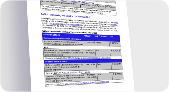FY21 ESG Disclosures July 2022 Unaudited 68 Table 39. Activity Metrics (PRO) Activity Metric Category Unit Of Measure Code Number of employees by: (1) full-time & part- time, (2) temporary, and (3) contract Quantitative Number SV-PS-000.A Numbers disclosed in SOC.4 Inclusion and Diversity – Workforce Metrics Employee hours worked, percentage billable Quantitative Hours, Percentage (%) SV-PS-000.B For FY21, employees worked approximately 96 million hours. For all employees the percentage billable was 82%; excluding corporate employees the percentage billable was 86%. SASB.2 Engineering and Construction Services (E&C) In recognition of Jacobs’ transformation to a technology-enabled solutions provider, MSCI Inc., the leading provider of critical decision support tools and services for the global investment community, changed our Global Industry Classifications Standard (GICS®) code to 20202020 (Research & Consulting Services), effective February 26, 2021. With the change occurring in the middle of the FY21 reporting period, we have elected to disclose to material Engineering & Construction Services metrics in alignment with SASB. Table 40. Sustainability Disclosure Topics and Accounting Metrics (E&C) Accounting Metric Category Unit Of Measure Code Environmental Impacts of Project Development Number of incidents of non-compliance with environmental permits, standards, and regulations Quantitative Number IF-EN-160.a.1 Zero Discussion of processes to assess and manage environmental risks associated with project design, siting, and construction Discussion and Analysis N/A IF-EN-160a.2 Discussion included in SOC.12 Health, Safety, Environment and Wellbeing – Management Workforce Health & Safety (1) Total recordable incident rate (TRIR) and (2) fatality rate for (a) direct employees and (b) contract employees Quantitative Rate IF-EN-320.a.1 Rates are disclosed in SOC.14 Health and Safety – Metrics Discussion of process to incorporate operational- phase energy and water efficiency considerations into project planning and design Discussion and Analysis N/A IF-EN-410.a.2 Discussion included in ENV.18 Environmental Impact in Project Design and Delivery