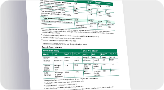 FY21 ESG Disclosures July 2022 Unaudited 15 ENV.9 Energy Consumption and Energy Intensity Metrics The following table summarizes our energy consumption. Table 8. Energy Consumption Metric Unit FY19 [a, b] FY20 [a, c] FY21 [a, d] Non-renewable fuels (gasoline, diesel, natural gas, etc.) purchased and consumed MWh 59,018 54,142 49,958 Non-renewable electricity purchased MWh 101,336 0 0 Purchased heating (non-renewable) MWh 35,043 36,848 26,997 Total renewable energy (wind, solar, hydroelectric, geothermal, etc.) purchased or generated MWh 12,155 112,589 100,208 Total Non-Renewable Energy Consumption MWh 195,397 90,990 76,955 Total costs of energy consumption (estimated) USD $11,991,945 $10,900,000 $9,700,000 Data coverage Percentage of global operations 100% 100% 100% [a] Emissions data has been third-party verified for all reporting years, with limited assurance. Cost of energy consumption is estimated based on available electricity, natural gas and vehicle fuel and does not include EAC costs associated with some of our renewable energy purchases. [b] Includes 4 months KeyW (acquired June 2019) & does not include ECR LOB (divested April 2019) [c] Includes 7 months Wood Nuclear Group (acquired March 2020) [d] Includes The Buffalo Group (acquired November 2020) The following table summarizes our Energy intensity metrics. Table 9. Energy Intensity Revenue Intensity Office Area Intensity Metric Unit FY20 [a, b] FY21 [a, c] Metric Unit FY20 [a, b] FY21 [a, c] Energy [d] MWh 203,579 177,163 Energy [e] MWh 149,437 129,326 Revenue Million USD 13,567 13,465 Office Area Thousand ft 2 7,590 7,337 Revenue Energy Intensity MWh per million USD 15.01 13.16 Office Area Energy Intensity MWh per Thousand ft 2 19.69 17.63 Data Coverage Percentage of global operations 100% 100% Data Coverage Percentage of global operations 100% 100% [a] Energy values have been third-party verified for all reported years, with limited assurance [b] Includes 7 months Wood Nuclear Group (acquired March 2020) [c] Includes Buffalo Group (acquired November 2020) [d] Metric for all scope 1 and scope 2 related energy consumption [e] Metric for scope 1 and scope 2 energy consumption associated with office space (for example, does not include mobile combustion sources)