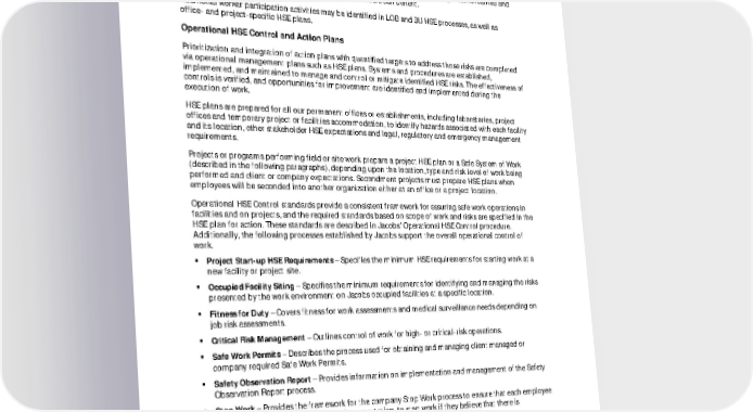 FY21 ESG Disclosures July 2022 Unaudited 43 Stop Work – Employees have the authority and are expected to stop work if they believe themselves, other people, or the environment may be or are at risk, or otherwise do not clearly understand how the risk is to be managed or controlled. High-Value Learning – Employees participate in identifying and communicating lessons learned and High-Value Learnings related to their work so that others can benefit. Additional worker participation activities may be identified in LOB and BU HSE processes, as well as office- and project-specific HSE plans. Operational HSE Control and Action Plans Prioritization and integration of action plans with quantified targets to address those risks are completed via operational management plans such as HSE plans. Systems and procedures are established, implemented, and maintained to manage and control or mitigate identified HSE risks. The effectiveness of controls is verified, and opportunities for improvement are identified and implemented during the execution of work. HSE plans are prepared for all our permanent offices or establishments, including laboratories, project offices and temporary project or facilities accommodation, to identify hazards associated with each facility and its location, other stakeholder HSE expectations and legal, regulatory and emergency management requirements. Projects or programs performing field or site work prepare a project HSE plan or a Safe System of Work (described in the following paragraphs), depending upon the location, type and risk level of work being performed and client or company expectations. Secondment projects must prepare HSE plans when employees will be seconded into another organization either at an office or a project location. Operational HSE Control standards provide a consistent framework for assuring safe work operations in facilities and on projects, and the required standards based on scope of work and risks are specified in the HSE plan for action. These standards are described in Jacobs’ Operational HSE Control procedure. Additionally, the following processes established by Jacobs support the overall operational control of work. Project Start-up HSE Requirements – Specifies the minimum HSE requirements for starting work at a new facility or project site. Occupied Facility Siting – Specifies the minimum requirements for identifying and managing the risks presented by the work environment on Jacobs occupied facilities at a specific location. Fitness for Duty – Covers fitness for work assessments and medical surveillance needs depending on job risk assessments. Critical Risk Management – Outlines control of work for high- or critical-risk operations. Safe Work Permits – Describes the process used for obtaining and managing client managed or company required Safe Work Permits. Safety Observation Report – Provides information on implementation and management of the Safety Observation Report process. Stop Work – Provides the framework for the company Stop Work process to ensure that each employee has the authority, and understands the expectation, to stop work if they believe that there is uncontrolled risk to themselves, others, the environment, or the community. In addition, LOBs and BUs augment these operational HSE Control requirements as needed based on their specific organizational needs, regional, national, or local requirements, and type of work performed. Additional LOB and BU HSE requirements are found in the Jacobs BMS.