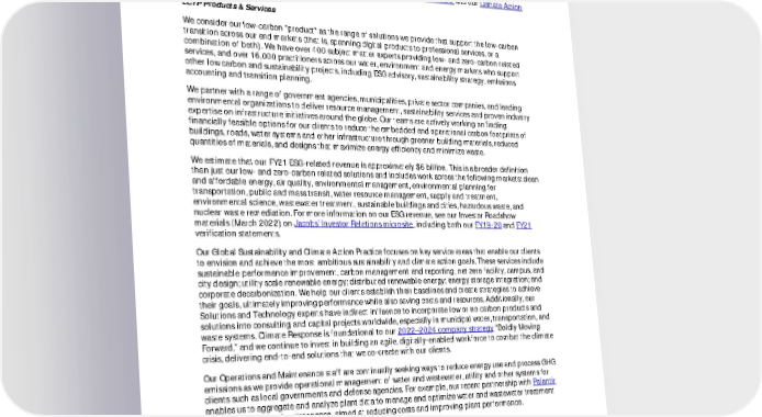 FY21 ESG Disclosures July 2022 Unaudited 23 Scottish Geographical Society , University of Edinburgh, University of Stirling and the Institute of Directors Scotland, the course provides a quick, simple and rounded introduction to the fundamentals of climate change. Jacobs’ business units are now required to report user completion rates on a quarterly basis. For more information on our employee engagement activities, see PlanBeyond 2.0 and our Climate Action Plan . LCTP Products & Services We consider our low-carbon "product" as the range of solutions we provide that support the low-carbon transition across our end markets (that is, spanning digital products to professional services, or a combination of both). We have over 400 subject matter experts providing low- and zero-carbon related services, and over 16,000 practitioners across our water, environment and energy markets who support other low carbon and sustainability projects, including ESG advisory, sustainability strategy, emissions accounting and transition planning. We partner with a range of government agencies, municipalities, private sector companies, and leading environmental organizations to deliver resource management, sustainability services and proven industry expertise on infrastructure initiatives around the globe. Our teams are actively working on finding financially feasible options for our clients to reduce the embedded and operational carbon footprints of buildings, roads, water systems and other infrastructure through greener building materials, reduced quantities of materials, and designs that maximize energy efficiency and minimize waste. We estimate that our FY21 ESG-related revenue is approximately $6 billion. This is a broader definition than just our low- and zero-carbon related solutions and includes work across the following markets: clean and affordable energy, air quality, environmental management, environmental planning for transportation, public and mass transit, water resource management, supply and treatment, environmental science, wastewater treatment, sustainable buildings and cities, hazardous waste, and nuclear waste remediation. For more information on our ESG revenue, see our Investor Roadshow materials (March 2022) on Jacobs’ Investor Relations microsite , including both our FY19-20 and FY21 verification statements. Our Global Sustainability and Climate Action Practice focuses on key service areas that enable our clients to envision and achieve the most ambitious sustainability and climate action goals. These services include sustainable performance improvement, carbon management and reporting, net zero facility, campus, and city design; utility scale renewable energy; distributed renewable energy; energy storage integration; and corporate decarbonization. We help our clients establish their baselines and create strategies to achieve their goals, ultimately improving performance while also saving costs and resources. Additionally, our Solutions and Technology experts have indirect influence to incorporate low or no carbon products and solutions into consulting and capital projects worldwide, especially in municipal water, transportation, and waste systems. Climate Response is foundational to our 2022–2024 company strategy “Boldly Moving Forward,” and we continue to invest in building an agile, digitally-enabled workforce to combat the climate crisis, delivering end-to-end solutions that we co-create with our clients. Our Operations and Maintenance staff are continually seeking ways to reduce energy use and process GHG emissions as we provide operational management of water and wastewater, utility and other systems for clients such as local governments and defense agencies. For example, our recent partnership with Palantir enables us to aggregate and analyze plant data to manage and optimize water and wastewater treatment plant operations and maintenance, aimed at reducing costs and improving plant performance. Our environmental solutions team is working with many clients on cutting-edge technology for contaminated site remediation and integrated waste management. Experts in our climate risk and resiliency practice support clients in managing the impacts of climate change, which includes the broad use of natural infrastructure solutions to build carbon sinks as engineered solutions for flood protection. We know resilience is an attribute of a smarter planet and requires planning and adapting ahead of potential threats like hurricanes, crumbling bridges and global pandemics. We help our clients survive, recover, adapt and thrive through change, no matter what adversities they experience.
