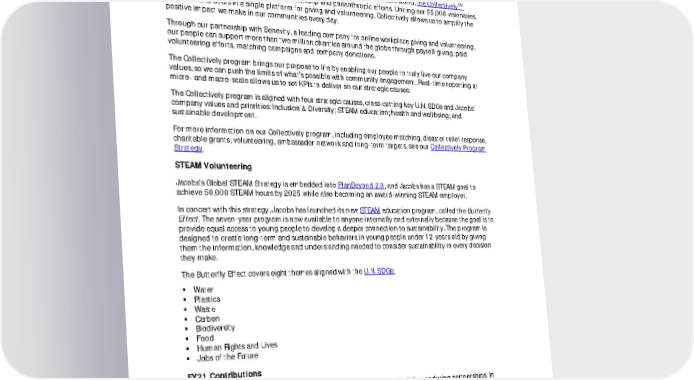 FY21 ESG Disclosures July 2022 Unaudited 38 SOC.11 Community Investment Collectively Program In alignment with Jacobs’ purpose of creating a more connected, sustainable world, the Collectively SM program is our approach to corporate citizenship and philanthropic efforts. Uniting our 55,000 visionaries, dreamers and doers in a single platform for giving and volunteering, Collectively allows us to amplify the positive impact we make in our communities every day. Through our partnership with Benevity, a leading company for online workplace giving and volunteering, our people can support more than two million charities around the globe through payroll giving, paid volunteering efforts, matching campaigns and company donations. The Collectively program brings our purpose to life by enabling our people to truly live our company values, so we can push the limits of what’s possible with community engagement. Real-time reporting at micro- and macro-scale allows us to set KPIs to deliver on our strategic causes. The Collectively program is aligned with four strategic causes, cross-cutting key U.N. SDGs and Jacobs’ company values and priorities: Inclusion & Diversity; STEAM education; health and wellbeing; and sustainable development. For more information on our Collectively program, including employee matching, disaster relief response, charitable grants, volunteering, ambassador network and long-term targets, see our Collectively Program Strategy. STEAM Volunteering Jacobs’s Global STEAM Strategy is embedded into PlanBeyond 2.0 , and Jacobs has a STEAM goal to achieve 50,000 STEAM hours by 2025 while also becoming an award-winning STEAM employer. In concert with this strategy, Jacobs has launched its new STEAM education program, called the Butterfly Effect . The seven-year program is now available to anyone internally and externally because the goal is to provide equal access to young people to develop a deeper connection to sustainability. The program is designed to create long-term and sustainable behaviors in young people under 12-years old by giving them the information, knowledge and understanding needed to consider sustainability in every decision they make. The Butterfly Effect covers eight themes aligned with the U.N. SDGs: Water Plastics Waste Carbon Biodiversity Food Human Rights and Lives Jobs of the Future FY21 Contributions We are committed to giving back, engaging with communities and building enduring partnerships. In FY21, we transitioned to an open matching giving program, meaning Jacobs matches employee donations systemwide to charities of our employees’ choosing, up to a set user cap per year (excluding religious and political causes). Throughout FY21, we supported disaster relief and significant days of importance across the world through the generosity of our employee donations and associated eligible matching contributions, and through company donations.