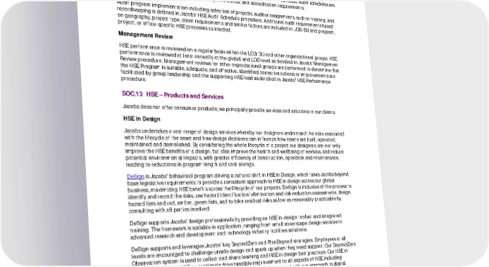 FY21 ESG Disclosures July 2022 Unaudited 48 HSE Auditing Auditing is a key component in verifying Jacobs’ HSE program implementation across the company and identifying areas for improvement. Audit schedules are developed by organizational HSE leads (for example, BU, regions, and global performance units) and approved by LOB HSE leads. Audit schedules are developed based on factors such as risk, negative trends, and accreditation requirements. Audit program implementation including selection of projects, auditor assignments, auditor training, and recordkeeping is defined in Jacobs’ HSE Audit Schedule procedure. Additional audit requirements based on geography, project type, client requirements and similar factors are included in LOB/BU and program, project, or office-specific HSE processes as needed. Management Review HSE performance is reviewed on a regular basis within the LOB/BU and other organizational groups. HSE performance is reviewed at least annually at the global and LOB level as detailed in Jacobs’ Management Review procedure. Management reviews for other organizational groups are performed to determine that the HSE Program is suitable, adequate, and effective. Identified corrective actions or improvements are facilitated by group leadership and the supporting HSE lead as detailed in Jacobs’ HSE Performance procedure. SOC.13 HSE – Products and Services Jacobs does not offer consumer products; we principally provide services and solutions to our clients. HSE in Design Jacobs undertakes a vast range of design services whereby our designers understand the risks associated with the lifecycle of the asset and how design decisions can influence how assets are built, operated, maintained and demolished. By considering the whole lifecycle of a project our designers can not only improve the HSE benefits of a design, but also improve the health and wellbeing of workers, and reduce potential environmental impacts, with greater efficiency of construction, operation and maintenance, leading to reductions in program length and cost savings. De5ign is Jacobs’ behavioral program driving a cultural shift in HSE in Design, which takes Jacobs beyond base legislative requirements to provide a consistent approach to HSE in design across our global business, maximizing HSE benefits across the lifecycle of our projects. De5ign is inclusive of the process to identify and record the risks, use hazard identification/elimination and risk reduction assessments, design hazard lists and red, amber, green lists, and to take residual risks as low as reasonably practicable by consulting with all parties involved. De5ign supports Jacobs’ design professionals by providing an HSE in-design toolset and integrated training. The framework is scalable in application, ranging from small streetscape design services to advanced research and development and technology industry facilities solutions. De5ign supports and leverages Jacobs’ key BeyondZero and PlanBeyond strategies. Employees at all levels are encouraged to challenge unsafe design and speak up when they need support. Our BeyondZero Observation system is used to collect and share learning and HSE in design best practices. Our HSE in Design reviews with HSE professionals drive tangible improvement to all aspects of HSE including wellbeing, occupational and mental health. HSE in De5ign is integrated with our approach to digital solutions, innovation, and technology to generate high value solutions for our clients and customers.