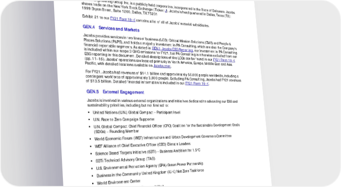 FY21 ESG Disclosures July 2022 Unaudited 6 Our FY21 GHG emissions were externally verified by a third party, Cameron-Cole, LLC. on February 24, 2022. Our limited assurance verification statements are published on the Jacobs Investor Relations ESG microsite, including both our FY19-20 and FY21 verification statements. GEN.3 General Information Jacobs Engineering Group Inc. is a publicly held corporation, incorporated in the State of Delaware. Jacobs shares trade on the New York Stock Exchange (Ticker: J). Jacobs is headquartered in Dallas, Texas (TX): 1999 Bryan Street, Suite 1200, Dallas, TX 75201 Exhibit 21 to our FY21 Form10-K contains a list of all of Jacobs’ material subsidiaries. GEN.4 Services and Markets Jacobs provides services in two lines of business (LOB): Critical Mission Solutions (CMS) and People & Places Solutions (P&PS), and holds a majority investment in PA Consulting, which are also the Company’s financial reportable segments. As stated in GEN.1 Jacobs ESG Reporting , our investment in PA Consulting is included within our scope 3 GHG emissions for FY21, but PA Consulting is otherwise excluded from our ESG reporting in this document. Detailed descriptions of the LOBs can be found in our FY21 Form 10-K (pp. 11–15). Jacobs’ operations are located primarily in North America, Europe, Middle East and Asia Pacific, with detailed locations available on Jacobs.com . For FY21, Jacobs had revenues of $14.1 billion and approximately 55,000 people worldwide, including a contingent workforce of approximately 3,000 people. Excluding PA Consulting, Jacobs had FY21 revenues of $13.5 billion. Detailed financial information is included in our FY21 Form 10-K . GEN.5 External Engagement Jacobs is involved in various external organizations and initiatives dedicated to advancing our ESG and sustainability priorities, including but not limited to: United Nations (U.N.) Global Compact – Participant level U.N. Race to Zero Campaign Supporter U.N. Global Compact Chief Financial Officer (CFO) Coalition for the Sustainable Development Goals (SDGs) – Founding Member World Economic Forum (WEF) Infrastructure and Urban Development Governors Committee WEF Alliance of Chief Executive Officer (CEO) Climate Leaders Science Based Targets Initiative (SBTi) – Business Ambition for 1.5°C SBTi Technical Advisory Group (TAG) U.S. Environmental Protection Agency (EPA) Green Power Partnership Business in the Community United Kingdom (U.K.) Net Zero Taskforce World Environment Center BSR (Businesses for Social Responsibility) Environmental Analyst – Sustainable Delivery Group Task Force on Climate-Related Financial Disclosures (TCFD) Supporter CDP Supply Chain Member Pledge to Net Zero Alliance Catalyst CEO Champions for Change