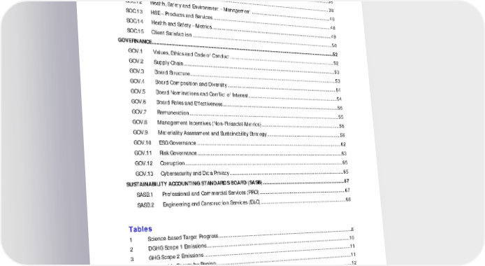 FY21 ESG Disclosures July 2022 Unaudited 3 SOC.8 Hiring and Retention ......................................................................................................................................... 35 SOC.9 Training and Development ............................................................................................................................. 35 SOC.10 Human Rights ....................................................................................................................................................... 36 SOC.11 Community Investment .................................................................................................................................... 38 SOC.12 Health, Safety and Environment – Management ................................................................................... 40 SOC.13 HSE – Products and Services .......................................................................................................................... 48 SOC.14 Health and Safety – Metrics ............................................................................................................................ 49 SOC.15 Client Satisfaction ............................................................................................................................................... 50 GOVERNANCE ...................................................................................................................................................................52 GOV.1 Values, Ethics and Code of Conduct ............................................................................................................ 52 GOV.2 Supply Chain ......................................................................................................................................................... 53 GOV.3 Board Structure .................................................................................................................................................... 53 GOV.4 Board Composition and Diversity ................................................................................................................. 54 GOV.5 Board Nominations and Conflict of Interest ............................................................................................. 54 GOV.6 Board Roles and Effectiveness ....................................................................................................................... 55 GOV.7 Remuneration ....................................................................................................................................................... 55 GOV.8 Management Incentives (Non-Financial Metrics) .................................................................................. 56 GOV.9 Materiality Assessment and Sustainability Strategy ............................................................................. 56 GOV.10 ESG Governance .................................................................................................................................................. 62 GOV.11 Risk Governance .................................................................................................................................................. 63 GOV.12 Corruption .............................................................................................................................................................. 65 GOV.13 Cybersecurity and Data Privacy ..................................................................................................................... 65 SUSTAINABILITY ACCOUNTING STANDARDS BOARD (SASB) .............................................................................67 SASB.1 Professional and Commercial Services (PRO) ......................................................................................... 67 SASB.2 Engineering and Construction Services (E&C) ......................................................................................... 68 Tables 1 Science-based Target Progress ....................................................................................................................................... 8 2 DGHG Scope 1 Emissions ............................................................................................................................................... 10 3 GHG Scope 2 Emissions .................................................................................................................................................. 11 4 Renewable Energy by Region........................................................................................................................................ 11 5 Scope 3 Indirect GHG Emissions Estimates ............................................................................................................. 12 6 GHG Intensity Metrics ...................................................................................................................................................... 14 7 Annual Renewable Electricity and Carbon Offset Purchases ............................................................................ 14 8 Energy Consumption ........................................................................................................................................................ 15 9 Energy Intensity .................................................................................................................................................................. 15