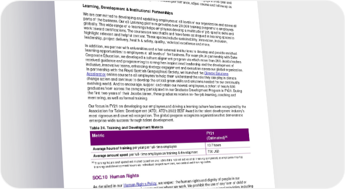 FY21 ESG Disclosures July 2022 Unaudited 36 platform and receive annual performance appraisals which include multidimensional feedback and systematic use of agreed measurable targets. In FY21 97% of our eligible employees participated in their annual conversation about their priorities and accomplishments. In between annual performance appraisals, employees also engage in mid-year and periodic performance check-ins with managers to discuss performance, adjust course and follow up as appropriate. Learning, Development & Institutional Partnerships We are committed to developing and upskilling employees at all levels of our organization and across all parts of the business. Our e3 Learning platform provides over 20,000 training programs to employees globally. The wide range of e-learnings helps employees develop a multitude of job-specific skills and work toward certifications. The courses are searchable and have been catalogued in learning spaces to highlight relevant and helpful content. These spaces include sustainability, innovation, inclusion, leadership, project delivery, health & safety, quality, technical excellence and more. In addition, we partner with universities and other external institutions to develop and provide enriched learning opportunities to employees at all levels of the business. For example, in partnership with Duke Corporate Education, we developed a culture alignment program via which more than 200 Jacobs leaders received guidance and programming to strengthen inspirational leadership and the development of inclusive, innovative teams, enhancing strategy engagement and execution across our global organization. In partnership with the Royal Scottish Geographical Society, we launched the Climate Solutions Accelerator online course to all employees to help them understand the role they can play in climate change action and continue to develop the critical green skills and solutions needed for our continually evolving world. And to encourage, support and retain our newest employees, a cohort of nearly 800 graduates from across the company participated in our Graduate Development Program in FY21. During the first two years of their Jacobs career, these graduates receive on-the-job learning, coaching and mentoring, as well as formal training Our focus in FY21 on developing our employees and driving a learning culture has been recognized by the Association for Talent Development (ATD). ATD’s 2022 BEST Award is the talent development industry’s most rigorous and coveted recognition. The global program recognizes organizations that demonstrate enterprise-wide success through talent development. Table 24. Training and Development Metrics Metric FY21 (Estimated) [a] Average hours of training per year per full-time employee 10.7 hours Average amount spent per full-time employee on training & development 700 USD [a] Training hours and spend estimated based on available data; not reflective of all training completed, as employees may log training and development hours via individual project numbers, not centralized training codes. SOC.10 Human Rights As detailed in our Human Rights Policy , we respect the human rights and dignity of people in our operations, supply chain, and communities where we work. We prohibit the use of any form of child or forced labor, slavery or trafficking of persons. Our approach is guided by international principles, including those encompassed in the U.N.’s Guiding Principles on Business and Human Rights, Universal Declaration of Human Rights, International Bill of Rights, and the International Labor Organization’s Declaration on Fundamental Principles and Rights at Work.