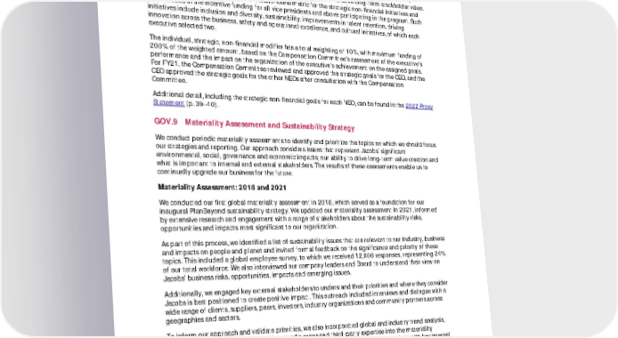 FY21 ESG Disclosures July 2022 Unaudited 56 GOV.8 Management Incentives (Non-Financial Metrics) In FY19, the Company introduced an individual strategic, non-financial modifier for the overall Leadership Performance Plan payout for the Named Executive Officers (NEOs) and the other senior executives to provide incentives and drive accountability for Company initiatives that drive long-term stockholder value. In FY21, the modifier was changed to a stand-alone metric for the strategic non-financial initiatives and was included in the incentive funding for all vice presidents and above participating in the program. Such initiatives include inclusion and diversity, sustainability, improvements in talent retention, driving innovation across the business, safety and operational excellence, and cultural initiatives, of which each executive selected two. The individual, strategic, non-financial modifier has a total weighting of 10%, with maximum funding of 200% of the weighted amount, based on the Compensation Committee’s assessment of the executive’s performance and the impact on the organization of the executive’s achievement on the assigned goals. For FY21, the Compensation Committee reviewed and approved the strategic goals for the CEO, and the CEO approved the strategic goals for the other NEOs after consultation with the Compensation Committee. Additional detail, including the strategic non-financial goals for each NEO, can be found in the 2022 Proxy Statement (p. 39–40). GOV.9 Materiality Assessment and Sustainability Strategy We conduct periodic materiality assessments to identify and prioritize the topics on which we should focus our strategies and reporting. Our approach considers issues that represent Jacobs’ significant environmental, social, governance and economic impacts; our ability to drive long-term value creation and what is important to internal and external stakeholders. The results of these assessments enable us to continually upgrade our business for the future. Materiality Assessment: 2018 and 2021 We conducted our first global materiality assessment in 2018, which served as a foundation for our inaugural PlanBeyond sustainability strategy. We updated our materiality assessment in 2021, informed by extensive research and engagement with a range of stakeholders about the sustainability risks, opportunities and impacts most significant to our organization. As part of this process, we identified a list of sustainability issues that are relevant to our industry, business and impacts on people and planet and invited formal feedback on the significance and priority of these topics. This included a global employee survey, to which we received 12,000 responses, representing 24% of our total workforce. We also interviewed our company leaders and Board to understand their view on Jacobs’ business risks, opportunities, impacts and emerging issues. Additionally, we engaged key external stakeholders to understand their priorities and where they consider Jacobs is best positioned to create positive impact. This outreach included interviews and dialogue with a wide range of clients, suppliers, peers, investors, industry organizations and community partners across geographies and sectors. To inform our approach and validate priorities, we also incorporated global and industry trend analysis, regulatory reviews, peer benchmarking, media scans and third-party expertise into the materiality assessment process. Upon developing a prioritized list, we conducted feedback sessions with key internal stakeholders and subject matter experts to review the findings and provide feedback into the next phase of sustainability strategy development. Ultimately, this resulted in the launch of our sustainable business approach, PlanBeyond 2.0 , described below in further detail.