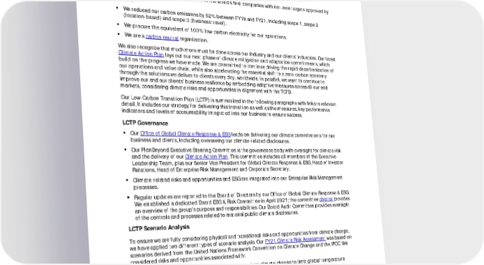 FY21 ESG Disclosures July 2022 Unaudited 21 ENV.17 Low-Carbon Transition Plan, Products and Services Since the release of our initial Climate Action Plan on the 50th Anniversary of Earth Day in 2020, we are proud of our progress and achievements, including: We are the first consultancy and one of the world’s first companies with net-zero targets approved by SBTi. We reduced our carbon emissions by 52% between FY19 and FY21, including scope 1, scope 2 (location-based) and scope 3 (business travel). We procure the equivalent of 100% low-carbon electricity for our operations. We are a carbon neutral organization. We also recognize that much more must be done across our industry and our clients’ industries. Our latest Climate Action Plan lays out our next phase of climate mitigation and adaptation commitments, which build on the progress we have made. We are committed to continue driving the rapid decarbonization of our operations and value chain, while also accelerating the essential shift to a zero-carbon economy through the solutions we deliver to clients every day, worldwide. In parallel, we want to continue to improve our and our clients’ business resilience by embedding adaptive measures across all our end markets, considering climate risks and opportunities in alignment with the TCFD. Our Low-Carbon Transition Plan (LCTP) is summarized in the following paragraphs with links to relevant detail. It includes our strategy for delivering this transition as well as the measures, key performance indicators and levels of accountability integrated into our business to ensure success. LCTP Governance Our Office of Global Climate Response & ESG leads on delivering our climate commitments for our business and clients, including overseeing our climate-related disclosures. Our PlanBeyond Executive Steering Committee is the governance body with oversight for climate risk and the delivery of our Climate Action Plan . This committee includes all members of the Executive Leadership Team, plus our Senior Vice President for Global Climate Response & ESG, Head of Investor Relations, Head of Enterprise Risk Management and Corporate Secretary. Climate-related risks and opportunities and ESG are integrated into our Enterprise Risk Management processes. Regular updates are reported to the Board of Directors by our Office of Global Climate Response & ESG. We established a dedicated Board ESG & Risk Committee in April 2021; the committee charter provides an overview of the group’s purpose and responsibilities. Our Board Audit Committee provides oversight of the controls and processes related to material public climate disclosures. LCTP Scenario Analysis To ensure we are fully considering physical and transitional risks and opportunities from climate change, we have applied two different types of scenario analysis. Our FY21 Climate Risk Assessment was based on scenarios derived from the United Nations Framework Convention on Climate Change and the IPCC. We considered risks and opportunities associated with: Successful implementation of the Paris Agreement on climate change to limit global temperature change during this century to 1.5°C above pre-industrial levels. Continued high growth in GHG emissions leading to average global warming of around 4°C by 2100. This scenario broadly coincides with the IPCC’s RCP8.5 scenario (from its Fifth Assessment Report, AR5). To further explore potential transitional risks from climate change for our FY22 Climate Risk Assessment, we adopted the Network for Greening the Financial System’s (NGFS) climate scenarios framework . The