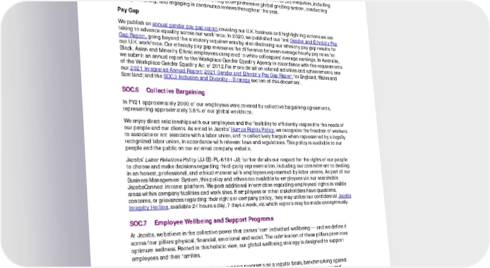 FY21 ESG Disclosures July 2022 Unaudited 33 practices set the foundation for our overall long-term strategy to attract and retain talent. We conduct multiple pay equity and promotion reviews each year to support our efforts to compensate and promote our employees in proportion to their efforts. In addition, we have an external consultant review our program on a periodic basis and provide detailed results and recommendations. We are committed to maintaining long-term, proactive approaches to monitor and resolve potential pay inequities, including utilizing pay equity analysis tools, implementing a comprehensive global grading system, conducting manager training, and engaging in continuous reviews throughout the year. Pay Gap We publish an annual gender pay gap report covering our U.K. business and highlighting actions we are taking to advance equality across our workforce. In 2020, we published our first Gender and Ethnicity Pay Gap Report, going beyond the statutory requirements by also disclosing our ethnicity pay gap results for our U.K. workforce. Our ethnicity pay gap measures the difference between average hourly pay rates for Black, Asian and Minority Ethnic employees compared to white colleagues’ average earnings. In Australia, we submit an annual report to the Workplace Gender Equality Agency in accordance with the requirements of the Workplace Gender Equality Act of 2012.For more detail on related activities and achievements, see our 2021 Integrated Annual Report ; 2021 Gender and Ethnicity Pay Gap Report for England, Wales and Scotland; and the SOC.3 Inclusion and Diversity – Strategy section of this document. SOC.6 Collective Bargaining In FY21 approximately 2000 of our employees were covered by collective bargaining agreements, representing approximately 3.6% of our global workforce. We enjoy direct relationships with our employees and the flexibility to efficiently respond to the needs of our people and our clients. As noted in Jacobs’ Human Rights Policy , we recognize the freedom of workers to associate or not associate with a labor union, and to collectively bargain when represented by a legally recognized labor union, in accordance with relevant laws and regulations. This policy is available to our people and the public on our external company website. Jacobs’ Labor Relations Policy (JJ-EB-PL-6101-JJ) further details our respect for the rights of our people to choose and make decisions regarding third-party representation, including our commitment to dealing in an honest, professional, and ethical manner with employees represented by labor unions. As part of our Business Management System, this policy and others are available to employees via our searchable JacobsConnect intranet platform. We post additional information regarding employees’ rights in visible areas within company facilities and work sites. If employees or other stakeholders have questions, concerns, or grievances regarding their rights or company policy, they may utilize our confidential Jacobs Integrity Hotline , available 24 hours a day, 7 days a week, via which reports may be made anonymously. SOC.7 Employee Wellbeing and Support Programs At Jacobs, we believe in the collective power that comes from individual wellbeing — and we define it across four pillars: physical, financial, emotional and social. The culmination of these pillars promotes optimum wellness. Rooted in this holistic view, our global wellbeing strategy is designed to support employees and their families. We evaluate our benefits and employee support programs on a regular basis, benchmarking against statutory requirements and market trends. We apply the results to inform policies, programs and partnerships to support our people worldwide. While specific offerings vary from country to country, examples include paid dependent care and special leave, support for parents, flexible working hours, remote and hybrid work arrangements, on-demand access to health providers and more.
