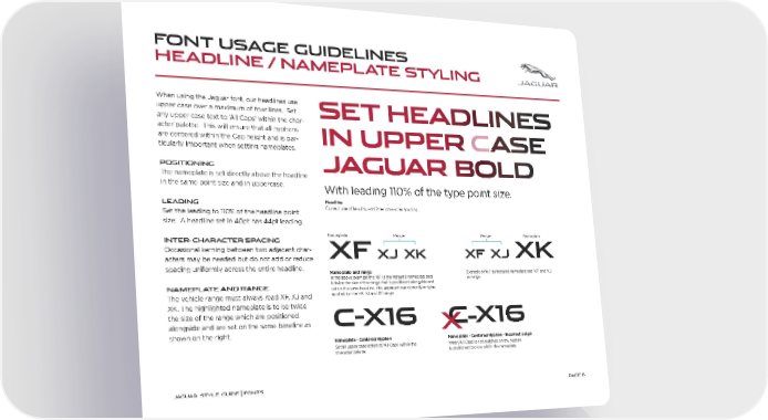 PAG E 6 When using the Jaguar font, our headlines use upper case over a maximum of four lines. Set any upper case text to ‘All Caps’ within the char - acter palette. This will ensure that all hyphens are centered within the Cap height and is par - ticularly important when setting nameplates. POSITIONING The nameplate is set directly above the headline in the same point size and in uppercase. LEADING Set the leading to 110% of the headline point size. A headline set in 40pt has 44pt leading. INTER-CHARACTER SPACING Occasional kerning between two adjacent char - acters may be needed but do not add or reduce spacing uniformly across the entire headline. NAMEPLATE AND RANGE The vehicle range must always read XF, XJ and XK. The highlighted nameplate is to be twice the size of the range which are positioned alongside and are set on the same baseline as shown on the right. FONT USAGE GUIDELINES HEADLINE / NAMEPLATE STYLING J AG U A R STYL E G UID E | FONTS With leading 110% of the type point size. Nameplate Range Range Nameplate XF XJ XK C ! X16 C ! X16 X XF XJ XK Nameplate and range Headline Correct use of leading and inter-character spacing. In the above example the ‘XF’ is the featured nameplate and is twice the size of the range that is positioned alongside and set on the same baseline. This approach can currently only be applied for the XK, XJ and XF range. Example of ‘XK’ as featured nameplate and ‘XF’ and ‘XJ’ as range. Set all upper case letters to ‘All Caps’ within the character palette. When ‘All Caps’ is not switched on the hyphen is positioned too low within the nameplate. Nameplate - Centered Hyphen Nameplate - Centered Hyphen - Incorrect usage SET HEADLINES IN UPPER CASE JAGUAR BOLD