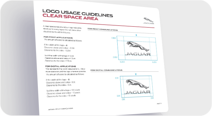PAG E 3 A clear space area around our logo helps it to stand out in every layout. Do not place other visual elements within this area. FOR PRINT APPLICATIONS The amount of space is calculated as follows: If the width of the logo = X Clearance above and below = 0.15X Clearance to the sides = 0.25X So if the width of the logo = 10cm Clearance above and below = 1.5cm Clearance to the sides = 2.5cm FOR DIGITAL APPLICATIONS This represents the worst case scenario. Allow more space around the logo wherever possible. The amount of space is calculated as follows: If the width of the logo = X Clearance above and below= 0.1X Clearance to the sides = 0.1X So if the width of the logo = 100 pixels Clearance above and below = 10 pixels Clearance to the sides = 10 pixels LOGO USAGE GUIDELINES CLEAR SPACE AREA J AG U A R STYL E G UID E | LO G OS FOR PRINT COMMUNICATIONS FOR DIGITAL COMMUNICATIONS 0.15X 0.15X 0.25X 0.25X X 0.1X 0.1X 0.1X 0.1X X