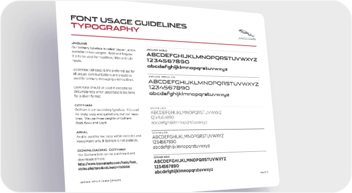 PAG E 5 JAGUAR Our primary typeface is called ‘Jaguar’, and is available in two weights: Bold and Regular. It is to be used for headlines, titles and sub- heads. Uppercase (all caps) is the preferred use for all Jaguar communications and should be used for primary messaging and headlines. Lowercase should be used in exceptional circumstances when uppercase is too large for a given format. GOTHAM Gotham is our secondary typeface. It is used for body copy and quotations, but not head - lines. We use three weights of Gotham: Bold, Book and Light. ARIAL Arial is used for live copy within websites and PowerPoint only, if Gotham is not available. DOWNLOADING GOTHAM The Gotham font can be purchased and downloaded from: http://www.typography.com/fonts/font_ styles.php?productLineID=100008 FONT USAGE GUIDELINES TYPOGRAPHY J AG U A R STYL E G UID E | FONTS JAGUAR BOLD ABCDEFGHIJKLMNOPQRSTUVWXYZ 1234567890 abcdefghijklmnopqrstuvwxyz J AG U A R R EG UL A R ABC D E F GH IJ K L M NO PQ RSTU VWX Y Z 1234567890 abcdefghijklmnopqrstuvwxyz GOTHAM LIGHT A BCDEF GHI JK LM N O PQRS T UVWXYZ 1234567890 abcdefghijklmnopqrstuvwxyz GOTHAM BOOK AB CDEF GH IJ K L M N O PQRS T UVWXYZ 1234567890 abcdefghijklmnopqrstuvwxyz GOTHAM BOLD AB C D EF GH IJK LM N O PQRS T UVWXYZ 1234567890 abcdefghijklmnopqrstuvwxyz