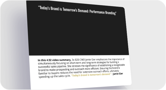 “Today’s Brand is Tomorrow's Demand: Performance Branding” In this 4:32 video summary, 3x B2B CMO Jamie Gier emphasizes the importance of simultaneously focusing on short-term and long-term strategies for building a successful sales pipeline. She stresses the significance of establishing a recognizable brand to make prospecting and outreach more efficient. Ensuring the brand is familiar to buyers reduces the need for extensive outreach efforts, ultimately speeding up the sales cycle. “Today’s brand is tomorrow’s demand.” - Jamie Gier