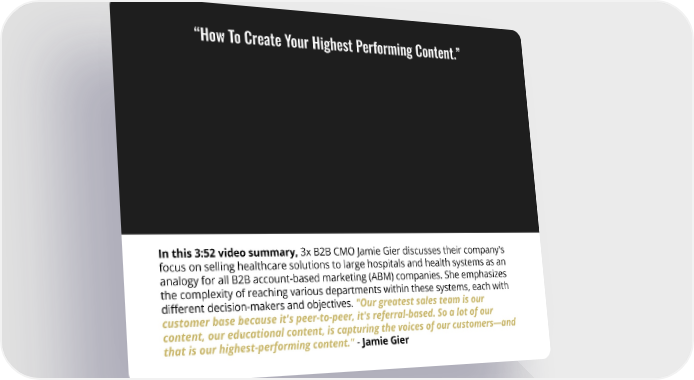 “How To Create Your Highest Performing Content.” In this 3:52 video summary, 3x B2B CMO Jamie Gier discusses their company's focus on selling healthcare solutions to large hospitals and health systems as an analogy for all B2B account-based marketing (ABM) companies. She emphasizes the complexity of reaching various departments within these systems, each with different decision-makers and objectives. "Our greatest sales team is our customer base because it's peer-to-peer, it's referral-based. So a lot of our content, our educational content, is capturing the voices of our customers—and that is our highest-performing content." - Jamie Gier