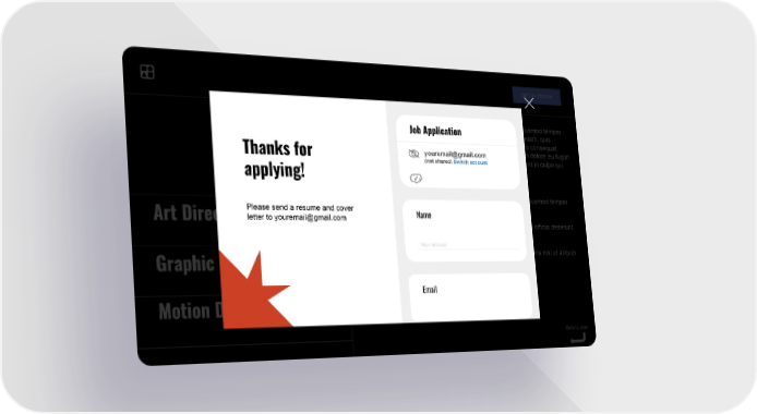 GET IN TOUCH Lorem ipsum dolor sit amet, consectetur adipiscing elit, sed do eiusmod tempor Job Application incididunt ut labore et dolore magna aliqua. Ut enim ad minim veniam, quis nostrud exercitation ullamco laboris nisi ut aliquip ex ea commodo consequat. Duis aute irure dolor in reprehenderit in voluptate velit esse cillum dolore eu fugiat [email protected] Thanks for (not shared) Switch account nulla pariatur. Excepteur sint occaecat cupidatat non proident, sunt in culpa qui officia deserunt mollit anim id est laborum. applying! TITLE Lorem ipsum dolor sit amet, consectetur adipiscing elit, sed do eiusmod tempor incididunt ut labore et dolore magna aliqua. Please send a resume and cover Name letter to [email protected] Art Director Excepteur sint occaecat cupidatat non proident, sunt in culpa qui officia deserunt mollit anim id est laborum. Your answer Ut enim ad minim veniam, quis nostrud exercitation ullamco laboris nisi ut aliquip ex ea commodo consequat. Graphic Designer Email Motion Designer Back to Jobs