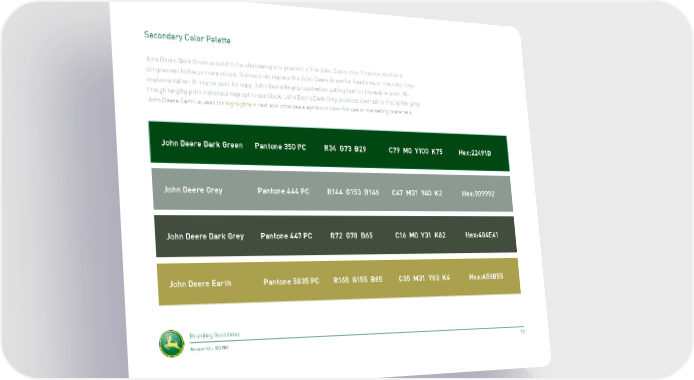 Secondary Color Palette John Deere Dark Green is used in the shadowing and gradient of the John Deere Icon. It can be used as a complement to the primary colors. It should not replace the John Deere Green for headlines or one color logo implementation. It may be used for copy. John Deere Grey is used when setting text for the web or print. Al- though lengthy print materials may opt to use black. John Deere Dark Grey provides contrast to the lighter grey. John Deere Earth is used for highlights in text and provides a symbolic color for use in marketing materials. John Deere Dark Green Pantone 350 PC R34 G73 B29 C79 M0 Y100 K75 Hex:22491D John Deere Grey Pantone 444 PC R144 G153 B146 C47 M31 Y40 K2 Hex:909992 John Deere Dark Grey Pantone 447 PC R72 G78 B65 C16 M0 Y31 K82 Hex:484E41 John Deere Earth Pantone 5835 PC R165 G155 B85 C35 M31 Y83 K4 Hex:A59B55 Branding Guidelines Version 1.2 – 07.29.08 13