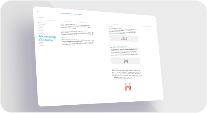 34 JOHNSON & JOHNSON CORPORATE DESIGN STANDARDS VERSION 2.1 35 Corporate Signature Our Corporate Signature Johnson & Johnson is the name of our company, and the entire J&J IN TEXT Signature Elements word-group is reflected in our Corporate Signature. The full name When J&J initials are used, they should appear in the same type style, Configurations must be used whenever possible. size, and color as the surrounding text. Ensure the two letters and Staging Area the ampersand symbol (&) are a single unit. Do not insert spaces in Color Variations However, in certain circumstances, an abbreviation of our name or logo between characters, or after each letter. Backgrounds may be employed. Such abbreviations cannot replace a legal corporate Minimum Size Our Name in Text designation where one is required. J&J Abbreviating THE INITIALS: J&J The only approved abbreviation for Johnson & Johnson in text is “J&J.” Our Name To determine where the use of this abbreviation would be appropriate International in contracts or other documents to identify the company, contact your Executions Johnson & Johnson lawyer. J&J IN WEB AND DIGITAL APPLICATIONS Incorrect Use When an ampersand symbol (&) is unavailable in applications such as web addresses, stock symbol, and email addresses, the following abbreviation may be used. There is no logo for this abbreviation, and the text may not be stylized. Where possible, the letters should appear in lowercase, but some applications, such as stock symbol, may require an uppercase treatment. jnj J&J AS A LOGO The only approved abbreviation of the Corporate Signature is the J&J logo. This logo may be substituted in select applications when space is limited and does not allow for the use of the full Corporate Signature and where approved by the Law Department. The J&J logo may be used for certain promotional items and on approved packaging applications consistent with the Corporate Signature Policy.