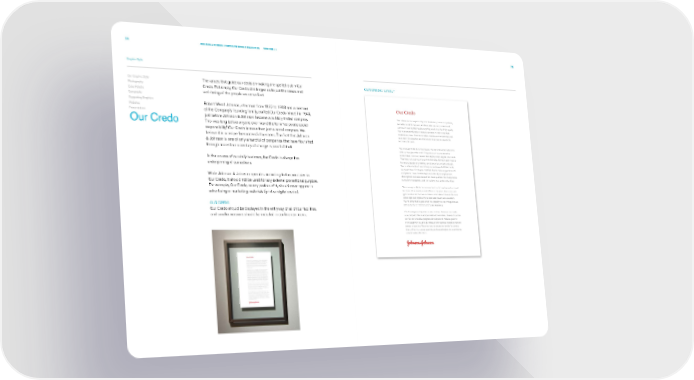 74 JOHNSON & JOHNSON CORPORATE DESIGN STANDARDS VERSION 2.1 75 Graphic Style Our Graphic Style The values that guide our decision-making are spelled out in Our OUR CREDO: LAYOUT Photography Credo. Put simply, Our Credo challenges us to put the needs and Color Palette well-being of the people we serve first. Typography Supporting Graphics Robert Wood Johnson, chairman from 1932 to 1963 and a member Our Credo Websites of the Company’s founding family, crafted Our Credo himself in 1943, Presentations We believe our first responsibility is to the doctors, nurses and patients, just before Johnson & Johnson became a publicly traded company. to mothers and fathers and all others who use our products and Our Credo This was long before anyone ever heard the term “corporate social services. In meeting their needs everything we do must be of high quality. We must constantly strive to reduce our costs in order to maintain responsibility.” Our Credo is more than just a moral compass. We reasonable prices. Customers’ orders must be serviced promptly and believe it is a recipe for successful business. The fact that Johnson accurately. Our suppliers and distributors must have an opportunity to make a fair profit. & Johnson is one of only a handful of companies that have flourished through more than a century of change is proof of that. We are responsible to our employees, the men and women who work with us throughout the world. Everyone must be considered as an individual. We must respect their dignity and recognize their merit. In the course of our daily business, the Credo is always the They must have a sense of security in their jobs. Compensation must be fair and adequate, and working conditions clean, orderly and safe. under pinning of our actions. We must be mindful of ways to help our employees fulfill their family responsibilities. Employees must feel free to make suggestions and complaints. There must be equal opportunity for employment, While Johnson & Johnson operates according to the principles in development and advancement for those qualified. We must provide Our Credo, it should not be used for any external promotional purpose. competent management, and their actions must be just and ethical. For example, Our Credo, or any portion of it, should never appear in We are responsible to the communities in which we live and work and advertising or marketing materials (print or digital media). to the world community as well. We must be good citizens — support good works and charities and bear our fair share of taxes. We must encourage civic improvements and better health and education. We must maintain in good order the property we are privileged to use, OUR CREDO protecting the environment and natural resources. Our Credo should be displayed in the entryway of all of our facilities, Our final responsibility is to our stockholders. Business must make and smaller versions should be included in conference rooms. a sound profit. We must experiment with new ideas. Research must be carried on, innovative programs developed and mistakes paid for. New equipment must be purchased, new facilities provided and new products launched. Reserves must be created to provide for adverse times. When we operate according to these principles, the stockholders should realize a fair return.