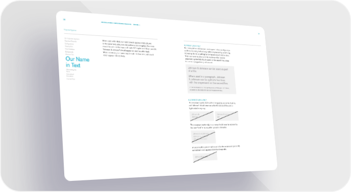 30 JOHNSON & JOHNSON CORPORATE DESIGN STANDARDS VERSION 2.1 31 Corporate Signature Our Corporate Signature When used within text, our name should appear unstylized, and CORRECT USE IN TEXT Signature Elements in the same font, color, and size as the surrounding text. Our name Our name, Johnson & Johnson, must appear in the same type style Configurations should be set in initial caps, with both “J’s” capitalized. When possible, as the surrounding text and may not be emphasized by underlining, Staging Area “Johnson & Johnson” should appear on one line within text. increasing its size, or setting the font appearance to bold or italic. Color Variations When necessary, our name may be split into two lines, but should When our name must be split into two lines within text, the Backgrounds never appear in three lines. ampersand symbol (&) should appear on the second line, unless Minimum Size this seems typographically unbalanced. Our Name in Text Johnson & Johnson can be used as part of a title. Abbreviating Our Name When used in a paragraph, Johnson International Executions & Johnson can be split into two lines Incorrect Use with the ampersand on the second line. IF THE SURROUNDING TEXT APPEARS IN UPPERCASE LETTERING, JOHNSON & JOHNSON MAY BE CAPITALIZED AS WELL. INCORRECT USE IN TEXT The ampersand symbol (&) must not hang at the end of the first line, and “Johnson” should never be split in the middle of the word or hyphenated in any way. Johnson & Johnson & John- Johnson son The ampersand symbol (&) in our name should never be replaced by the word “and,” or by any other symbol or character. Johnson and Johnson Johnson + Johnson Johnson~Johnson A space must be present before and after the ampersand symbol (&) so that each word appears distinct and separate. Johnson&Johnson