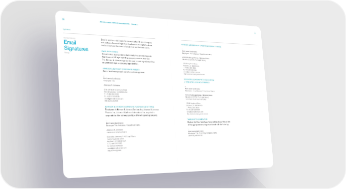 50 JOHNSON & JOHNSON CORPORATE DESIGN STANDARDS VERSION 2.1 51 Applications Business Stationery Email is used on a daily basis to communicate with our colleagues JOHNSON & JOHNSON IN OPERATING COMPANY’S NAME and partners. Our email signature functions as our digital business Email card and contains the same information as our business cards. -- First name Last name Signatures Employee Title, Subgroup / Department Name EMAIL SIGNATURES Signage It must include appropriate contact details, the correct Corporate OPCO Full Legal Name / Division Name Signature and full legal operating company name in plain text. Division of [OPCO Full Legal Name] The Johnson & Johnson logo can be used in email signatures either 12345 Anystreet Drive as a company logo or company logo identifier. Anytown, ST 00000 USA T: +0 000 000 0000 M: +0 000 000 0000 JOHNSON & JOHNSON (CORPORATE PARENT) [email protected] Senior level management and others where approved. http://www.companywebsite.com -- OPERATING COMPANY WITH DESCRIPTOR: First name Last name A JOHNSON & JOHNSON COMPANY Employee Title Johnson & Johnson -- First name Last name One Johnson & Johnson Plaza Employee Title, Subgroup / Department Name New Brunswick, NJ 08933 USA T: +0 000 000 0000 OPCO Full Legal Name / Division Name M: +0 000 000 0000 Division of [OPCO Full Legal Name] [email protected] a Johnson & Johnson company http://www.jnj.com 12345 Anystreet Drive Anytown, ST 00000 USA JOHNSON & JOHNSON CORPORATE FUNCTION OR INITIATIVE T: +0 000 000 0000 Employees of Johnson & Johnson Services, Inc., Johnson & Johnson M: +0 000 000 0000 Finance, Inc., Johnson & Johnson International, Inc., or part of a [email protected] corporate function but employed by a different operating company. http://www.companywebsite.com -- THIRD-PARTY CONTRACTOR First name Last name Replace the First Name Last Name and Employee Title portion Employee Title, Subgroup / Department Name of the appropriate email signature format with the following: Johnson & Johnson Function or Initiative Name -- First name Last name Operating Company’s Full Legal Name Employee Title, Third Party Company Name 12345 Anystreet Drive providing services for: Anytown, ST 00000 USA T: +0 000 000 0000 M: +0 000 000 0000 [email protected] http://www.jnj.com