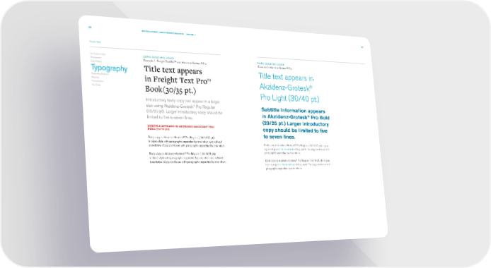 66 JOHNSON & JOHNSON CORPORATE DESIGN STANDARDS VERSION 2.1 67 Graphic Style Our Graphic Style USING SCALE AND COLOR USING SCALE AND COLOR Photography ® ® Example 1: Freight Text Pro™ and Akzidenz-Grotesk Pro Example 2: Akzidenz-Grotesk Pro Color Palette Title text appears Typography Title text appears in Supporting Graphics ™ Websites in Freight Text Pro ® Presentations Akzidenz-Grotesk Our Credo Book(30/35 pt.) Pro Light (30/40 pt.) Introductory body copy can appear in a larger ® size using Akzidenz-Grotesk Pro Regular Subtitle information appears ( 15/20 pt). Larger introductory copy should be ® limited to five to seven lines. in Akzidenz-Grotesk Pro Bold (20/25 pt.) Larger introductory SUBTITLE APPEARS IN AKZIDENZ-GROTESK® PRO copy should be limited to five BOLD (10/10 pt.) to seven lines. ® Body copy is Akzidenz-Grotesk Pro Regular (10/14.25 pt.) in black style with paragraphs separated by one return and without ® indentation. Copy continues with paragraphs separated by one return. Body copy is Akzidenz-Grotesk Pro Regular (10/14.25 pt.) in gray style using color for emphasis of key point. The copy continues with ® paragraphs separated by one return. Body copy is Akzidenz-Grotesk Pro Regular (10/14.25 pt.) in black style with paragraphs separated by one return and without ® indentation. Copy continues with paragraphs separated by one return. Body copy is Akzidenz-Grotesk Pro Regular (10/14.25 pt.) in gray style using color for emphasis of key point. The copy continues with paragraphs separated by one return.