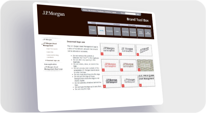 JPMorgan Brand Book Page 23 Page 25J.P. Morgan J.P. Morgan Asset Management Asia application J.P. Morgan Asset Management Dual Logo Logo free space Logo size Logo positioning standards Incorrect logo use