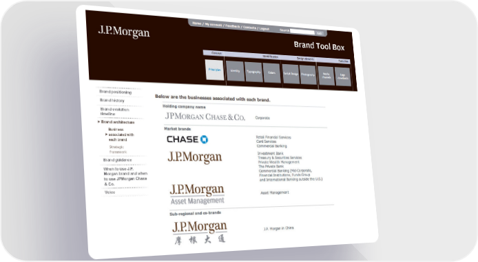 Brand positioning Brand history Business associated with each brand Brand evolution timeline Brand architecture Brand guidance Voice When to use J.P. Morgan brand and when to use JPMorgan Chase & Co. Strategic framework