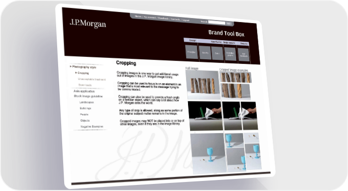 JPMorgan Brand Book Page 43 Page 45Photography style Stock image guideline Landscapes People Objects Negative Examples Buildings Asia application Cropping Downloads Unacceptable treatment