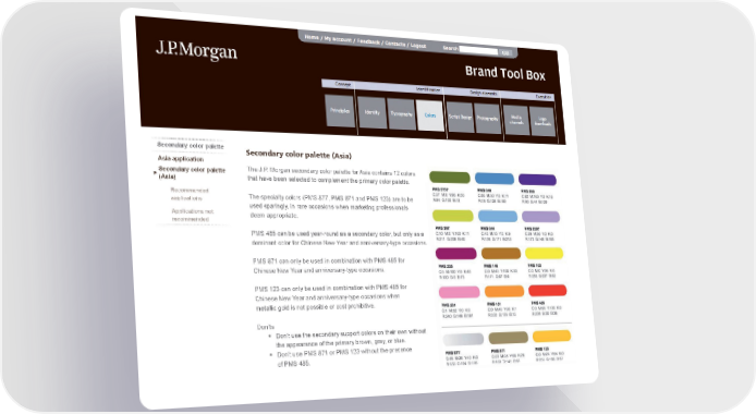 The J.P. Morgan secondary color palette for Asia contains 12 colors that have been selected to complement the primary color palette. The specialty colors (PMS 877, PMS 871 and PMS 123) are to be used sparingly, in rare occasions when marketing professionals deem appropriate. PMS 485 can be used year-round as a secondary color, but only as a dominant color for Chinese New Year and anniversary-type occasions. PMS 871 can only be used in combination with PMS 485 for Chinese New Year and anniversary-type occasions. PMS 123 can only be used in combination with PMS 485 for Chinese New Year and anniversary-type occasions when metallic gold is not possible or cost prohibitive. Don’ts • Don’t use the secondary support colors on their own without the appearance of the primary brown, gray, or blue. • Don’t use PMS 871 or PMS 123 without the presence of PMS 485. Secondary color palette (Asia) Secondary color palette Secondary color palette (Asia) Recommended applications Applications not recommended Asia application