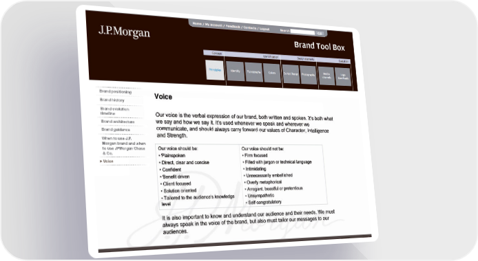 Brand positioning Brand history Brand evolution timeline Brand architecture Brand guidance Voice When to use J.P. Morgan brand and when to use JPMorgan Chase & Co.