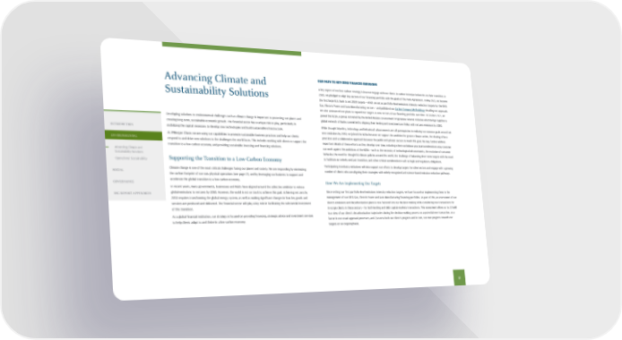 Advancing Climate and Sustainability Solutions Developing solutions to environmental challenges such as climate change is important to protecting our planet and creating long-term, sustainable economic growth. The financial sector has a unique role to play, particularly in mobilizing the capital necessary to develop new technologies and build sustainable infrastructure. At JPMorgan Chase, we are using our capabilities to promote sustainable business practices and help our clients respond to and drive new solutions to the challenges the world faces. This includes working with clients to support the transition to a low-carbon economy and providing sustainable investing and financing solutions. Supporting the Transition to a Low-Carbon Economy Climate change is one of the most critical challenges facing our planet and society. We are responding by minimizing the carbon footprint of our own physical operations (see page 17), and by leveraging our business to support and accelerate the global transition to a low-carbon economy. In recent years, many governments, businesses and NGOs have aligned around the collective ambition to reduce global emissions to net zero by 2050. However, the world is not on track to achieve this goal. Achieving net zero by 2050 requires transforming the global energy system, as well as making significant changes in how key goods and services are produced and delivered. The financial sector will play a key role in facilitating the substantial investment of this transition. As a global financial institution, our strategy is focused on providing financing, strategic advice and investment services to help clients adapt to and thrive in a low-carbon economy. OUR PATH TO NET-ZERO FINANCED EMISSIONS A key aspect of our low-carbon strategy is how we engage with our clients in carbon-intensive industries on their transition. In 2020, we pledged to align key sectors of our financing portfolio with the goals of the Paris Agreement. In May 2021, we became the first large U.S. bank to set 2030 targets – which we set as portfolio-level emissions intensity reduction targets for the Oil & Gas, Electric Power and Auto Manufacturing sectors – and published our Carbon Compass Methodology detailing our approach. We also announced our plans to expand our targets to new sectors of our financing portfolio over time. In October 2021, we joined the NZBA, a group convened by the United Nations Environment Programme Finance Initiative which brings together a global network of banks committed to aligning their lending and investment portfolios with net zero emissions by 2050. While thoughtful policy, technology and behavioral advancements are all prerequisites in realizing our common goals around net zero emissions by 2050, we joined the NZBA because we support the ambition for greater climate action, the sharing of best practices and a collaborative approach between the public and private sectors to reach this goal. We may further address important details of these efforts as they develop over time, including where we believe practical considerations may constrain our work against the ambitions of the NZBA – such as the necessity of technological advancements, the evolution of consumer behavior, the need for thoughtful climate policies around the world, the challenge of balancing short-term targets with the need to facilitate an orderly and just transition, and other critical considerations such as legal and regulatory obligations. Participating in industry initiatives will also support our efforts to develop targets for other sectors and engage with a growing number of clients who are aligning their strategies with widely-recognized and science-based emission reduction pathways. How We Are Implementing Our Targets Since setting our first portfolio-level emissions intensity reduction targets, we have focused on implementing them in the management of our Oil & Gas, Electric Power and Auto Manufacturing financing portfolios. As part of this, an assessment of our client's emissions and decarbonization plans is now factored into our decision-making while considering new transactions for in-scope clients in these sectors – for both lending and debt capital markets transactions. This assessment allows us to: 1) build in a view of our client's decarbonization trajectories during the decision-making process on a potential new transaction, as a factor in our usual approval processes, and 2) assess both our client's progress and in turn, our own progress towards our targets on an ongoing basis. 12 INTRODUCTION ENVIRONMENTAL Advancing Climate and Sustainability Solutions Operational Sustainability SOCIAL GOVERNANCE ESG REPORT APPENDICES