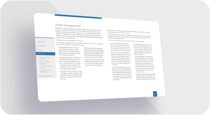 Oversight and Management of ESG Responsibility for oversight and management of ESG is defined at multiple levels within the organization. Oversight of ESG matters is an important part of the Board's work in setting the policies and principles that govern our business, including the Firm's governance-related policies and practices, our systems of risk management and controls, our investment in our employees and how we advance sustainability in our business and operations. In the past year, in addition to the work of the committees, all directors participated in full Board discussion regarding the Firm's approach to COVID-19, racial equity and climate change. Additionally, our director education program includes ESG issues. Each of the Board’s standing committees oversees reputational and conduct risks, within its scope of responsibility, and assists the Board in its oversight of various ESG issues. For example: • The Public Responsibility Committee oversees the Firm’s significant policies and practices regarding political contributions, major lobbying priorities and principal trade association memberships that relate to the Firm's public policy objectives. • The Compensation & Management Development Com - mittee, among other things, reviews and approves the Firm’s compensation and qualified benefit pro - grams. It also oversees the Firm’s culture, including reviewing diversity programs, which includes the Accountability Framework as it applies to members of the Operating Committee (see page 27). • The Risk Committee assists the Board in its oversight of management’s responsibility to implement a global risk management framework reasonably designed to identify, assess and manage the Firm’s risks, includ - ing ESG risks. • The Audit Committee helps oversee management’s compliance with the Firm’s ethical standards, policies, plans and procedures, and with laws and regulations. It also reviews the program established by manage- ment that monitors compliance with the Code of Con- duct, and reviews the record of such compliance. • The Corporate Governance & Nominating Committee exercises general oversight with respect to the gov - ernance of the Board, including its composition, nominees and framework for self-assessment. Senior management – including the Operating Committee and leaders within each of our lines of business – is responsible for driving strategy and execution on ESG matters across the Firm. The Chief Risk Officer, the Head of Human Resources, the Global Head of Diversity and Inclusion, the Global Head of Corporate Responsibility, the Global Head of Sustainability and other senior leaders provide periodic updates on ESG initiatives to the Operating Committee and Board of Directors. ESG efforts are spearheaded by several specialist teams across the Firm, with some examples including: • The Office of the Secretary partners with senior man - agement, control groups, lines of business and corpo - rate units to promote effective governance of the Firm. It also works closely with the Board of Directors on ESG matters, including responding to shareholder proposals. • The Office of Diversity, Equity and Inclusion leads the development and implementation of the Firm’s strategy to enhance DEI within our organization and support underserved communities. This includes continuing to advance programs and initiatives that incorporate a diversity lens into how the Firm develops products and services, serves clients, helps communities and sup - ports employees. • Our Corporate Responsibility team works to design, implement and evaluate community and philanthropic programs that open new pathways to economic oppor - tunity for individuals, provide actionable insight to civic and community leaders and protect the environment. It is composed of Government Relations, Public Engage - ment, Sustainability, Global Philanthropy and Research and Policy teams. • Our Corporate Sustainability team, which reports to the Global Head of Corporate Responsibility, provides advice on the Firm’s approach to managing ESG matters, sup - porting the development of sustainability- and climate-fo - cused business strategies and financing opportunities, engaging with stakeholders and facilitating external reporting on these matters. • Our Operational Sustainability team coordinates groups across our Chief Administrative Office – which includes Global Real Estate, Global Supplier Services and Firmwide Business Resiliency – to develop and execute the Firm’s strategy to minimize the environmental impact of our operations and supply chain. This team is responsible for achieving our operational sustainability targets, including our commitment to maintain carbon neutral operations and source renewable energy for 100% of our global power needs annually. • Our Climate Risk and Global Environmental and Social Risk Management ("GESRM") teams are responsible for estab - lishing our internal approach to managing climate risk as well as the Firm’s environmental and social risk standards. 51 INTRODUCTION ENVIRONMENTAL SOCIAL GOVERNANCE Corporate Governance and ESG Oversight Stakeholder Engagement Risk Management Data Privacy and Cybersecurity Business Ethics Political Engagement and Public Policy ESG REPORT APPENDICES