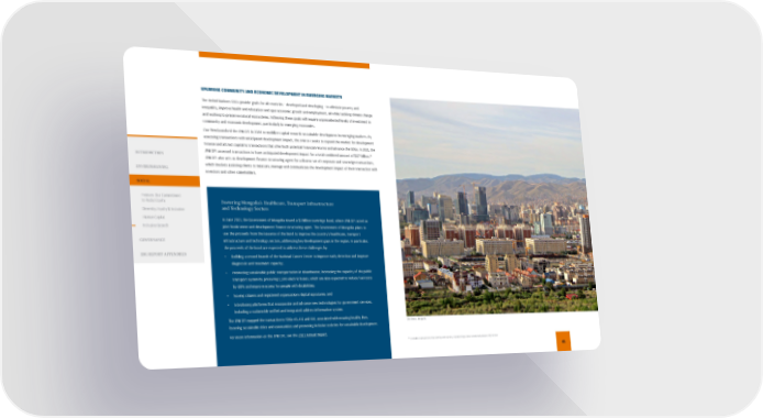 SPURRING COMMUNITY AND ECONOMIC DEVELOPMENT IN EMERGING MARKETS The United Nations SDGs provide goals for all countries – developed and developing – to alleviate poverty and inequality, improve health and education and spur economic growth and employment, all while tackling climate change and working to preserve natural ecosystems. Achieving these goals will require unprecedented levels of investment in community and economic development, particularly in emerging economies. Our Firm launched the JPM DFI in 2020 to mobilize capital towards sustainable development in emerging markets. By assessing transactions with anticipated development impact, the JPM DFI seeks to expand the market for development finance and attract capital to transactions that offer both potential financial returns and advance the SDGs. In 2021, the JPM DFI assessed transactions to have anticipated development impact for a total combined amount of $117 billion. JPM DFI also acts as development finance structuring agent for a diverse set of corporate and sovereign transactions, which involves assisting clients to measure, manage and communicate the development impact of their transaction with investors and other stakeholders. 32 32 Excludes transactions that overlap with Green, representing a total combined amount of $7 billion Fostering Mongolia’s Healthcare, Transport Infrastructure and Technology Sectors In June 2021, the Government of Mongolia issued a $1 billion sovereign bond, where JPM DFI acted as joint bookrunner and development finance structuring agent. The Government of Mongolia plans to use the proceeds from the issuance of the bond to improve the country’s healthcare, transport infrastructure and technology sectors, addressing key development gaps in the region. In particular, the proceeds of the bond are expected to address these challenges by: • Building a second branch of the National Cancer Center to improve early detection and improve diagnostic and treatment capacity; • Promoting sustainable public transportation in Ulaanbaatar, increasing the capacity of the public transport system by procuring 1,500 electric buses, which are also expected to reduce fuel costs by 65% and improve access for people with disabilities; • Issuing citizens and registered organizations digital signatures; and • Introducing platforms that incorporate and advance new technologies for government services, including a nationwide unified and integrated address information system. The JPM DFI mapped the transaction to SDGs #3, #11 and #16, associated with ensuring healthy lives, fostering sustainable cities and communities and promoting inclusive societies for sustainable development. For more information on the JPM DFI, see the 2021 Annual Report . Ulan Bator, Mongolia 45 INTRODUCTION ENVIRONMENTAL SOCIAL Feature: Our Commitment to Racial Equity Diversity, Equity & Inclusion Human Capital Inclusive Growth GOVERNANCE ESG REPORT APPENDICES