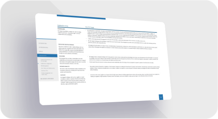 Stakeholder Group How We Engage SHAREHOLDERS We engage shareholders on important topics including corporate governance, shareholder rights, executive compensation and sustainability. • We communicate to shareholders through our Annual Report and Proxy Statement, Securities and Exchange Commission filings, press releases and the Firm’s website. In addition, we engage with shareholders through quarterly earnings calls, investor meetings and conferences, annual shareholder meetings and other forums. We conduct a formal shareholder outreach program focused on topics including corporate governance, shareholder rights, executive compensation and sustainability. In these meetings, management shares information and provides updates on these topics, addresses questions and solicits shareholders’ perspectives and feedback. Directors participate in these meetings as appropriate. Following each shareholder outreach program, shareholders’ areas of focus and feedback are shared with the Board. • In 2021, we had approximately 90 engagements with nearly 70 shareholders, representing approximately 46% of the Firm’s outstanding common stock. • We also engage in dialogue with shareholders outside these more formal channels. These engagements provide us with useful feedback, which we consider when developing the Firm’s processes, practices and strategic direction. REGULATORS AND POLICYMAKERS We strive to maintain an open, ongoing dialogue with our global supervisory regulators and other policymakers. We believe that responsible corporate citizenship demands a strong commitment to a healthy and informed democracy through civic and community involvement. • We engage with policymakers on a range of issues, including banking, financial services, cybersecurity, workforce development, small business, tax, trade and inclusive economic growth, among others. We engage with regulators as necessary to conduct business and provide commentary on proposed changes to relevant regulations affecting our business. ESG RATERS We recognize that our clients, shareholders and other stakeholders are interested in our performance on a range of ESG matters. We regularly engage with ESG raters to provide them with information relevant to the Firm. • We engage in open, transparent dialogue with rating agencies in order to better understand their methodologies and scoring, correct discrepancies and provide feedback. Our Corporate Sustainability and Investor Relations teams manage our relationships with ESG rating agencies and lead our efforts to identify and implement enhancements to policies, procedures and practices that can improve our ESG performance and address any known issues. • We also spend time and resources to educate relevant internal stakeholders about ESG ratings so they are prepared to respond to questions from clients about the subject. RESEARCH ANALYSTS We strive to meet the information needs of members of the investment community, including both financial and ESG analysts and researchers. • We provide extensive information to members of the investment community, including both financial and ESG analysts and researchers, through reports, presentations, quarterly earnings, regulatory filings, conferences and publications on our website. In addition, we respond to surveys and specific information requests, and engage with analysts and researchers through calls and meetings. SUPPLIERS We engage in dialogue with our key suppliers on topics including our ability to operate efficiently and effectively, deliver products and services that meet our clients’ and customers’ needs, manage risk and controls and drive our diversity, equity and inclusion agenda. • We interact with our key suppliers on a frequent basis through various channels, including regular business reviews, ad hoc meetings, phone, town halls and email. We are committed to holding our suppliers to high standards of business conduct and integrity, and we work together to make a positive impact in the communities where we do business. 53 INTRODUCTION ENVIRONMENTAL SOCIAL GOVERNANCE Corporate Governance and ESG Oversight Stakeholder Engagement Risk Management Data Privacy and Cybersecurity Business Ethics Political Engagement and Public Policy ESG REPORT APPENDICES
