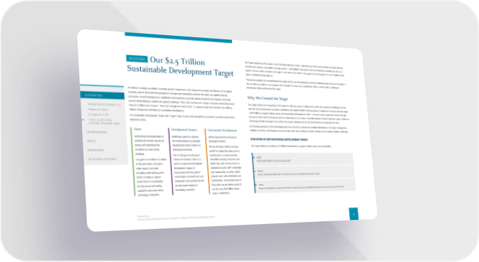Our $2.5 Trillion Sustainable Development Target We believe creating sustainable economic growth is important to the long-term strength and vibrancy of the global economy, and to the health and prosperity of people and communities around the world. As a global financial institution, we are leveraging our capabilities and expertise to provide capital and advice that supports economic growth while helping to address key global challenges. That is why we have set a target to finance and facilitate more than $2.5 trillion over 10 years – from 2021 through the end of 2030 – to advance long-term solutions that address climate change and contribute to sustainable development. Our Sustainable Development Target (the “Target”) aims to grow and strengthen our business activities across three important areas: Green Accelerating the deployment of solutions for cleaner sources of energy and facilitating the transition to a low-carbon economy. Our goal is to facilitate $1 trillion in this area alone, through a wide range of activities including underwriting green bonds, lending to support construction of sustainable infrastructure and raising capital for innovative clean technology companies. Development Finance Mobilizing capital to advance the United Nations Sustainable Development Goals ("SDGs") in emerging economies . The J.P. Morgan Development Finance Institution ("JPM DFI") works to assess the anticipated development impact of transactions with the goal of attracting institutional investors interested in environmental and socioeconomic impact in developing countries. Community Development Advancing economic inclusion in developed markets. We are working to bolster inclusive growth by supporting areas such as small business, homeownership, affordable housing, education and health care, with a focus on low-to- moderate income ("LMI") individuals and communities, as well as Black, Hispanic and Latino individuals and communities. This includes many of the actions we are taking as part of our five-year, $30 billion Racial Equity Commitment. The Target represents a key aspect of our Firmwide approach to ESG – supporting our clients and customers through financing act ivities that advance sustainable economic growth – and highlights the work of other key initiatives, including our efforts to support the low-carbon transition (see page 12), the work of the JPM DFI (see page 9) and the progress of our $30 billion Racial Equity Commitment (see page 21). This section explains why we developed the Target and how we are organizing to drive its implementation across our business. It also provides an update on our progress and examples of transactions completed in 2021, as well as links to additional information within and beyond this report. Why We Created the Target The Target reflects our recognition of the need for collective action to address the world’s most important challenges and the role that the financial sector can play in mobilizing the capital needed to drive progress. It expands on our prior one-year target – $200 billion to support climate action and sustainable development in 2020 – to a new, 10-year target that extends through the end of 2030, which corresponds with the timeframe we set to meet our initial emission intensity reduction targets within our financing portfolio (see page 12) as well as the current timeframe set by the United Nations for achieving the SDGs. By drawing awareness to the work happening across the Firm to advance sustainable development, the Target is designed to mobilize our efforts and sharpen our focus on key areas that contribute towards solutions for the world’s toughest challenges. EVOLUTION OF OUR SUSTAINABLE DEVELOPMENT TARGET The Target builds on our history of fulfilled commitments to support climate action and sustainability. 2017 Facilitate $200 billion in clean financing by 2025 1 2020 Finance and facilitate $200 billion for climate action and sustainable development in 2020 2 2021 Finance and facilitate more than $2.5 trillion for climate action and sustainable development over 10 years, by the end of 2030 FEATURE 1 Achieved in 2020. 2 Achieved in 2020, by financing over $220 billion in transactions, including more than $55 billion toward green initiatives. 6 INTRODUCTION Message from Our Chairman & CEO Company at a Glance Our Approach to ESG Feature: Our $2.5 Trillion Sustainable Development Target ENVIRONMENTAL SOCIAL GOVERNANCE ESG REPORT APPENDICES