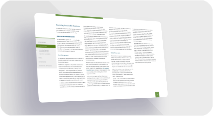 Providing Sustainable Solutions In combination with our low-carbon transition strategy, we also continue to grow a range of sustainability-focused financing and investing solutions across the Firm. ASSET AND WEALTH MANAGEMENT J.P. Morgan AWM is a global leader in asset and wealth management services, which serves institutional, ultra-high net worth, high net worth and individual clients through its AWM businesses. With combined overall client assets of $4.3 trillion and assets under management ("AUM") of $3.1 trillion as of December 31, 2021, we are one of the largest asset and wealth managers in the world. Asset Management J.P. Morgan Asset Management believes that consideration of financially material ESG factors can be an important part of the investment process. We define ESG integration as the systematic inclusion of ESG issues in investment analysis and investment decisions. In actively managed assets deemed by J.P. Morgan Asset Management to be ESG integrated under our governance process, we systematically assess financially material ESG factors in our investment decisions with the goals of reducing risk and improving long-term returns. ESG integration does not change a strategy’s investment objective, exclude specific types of companies or constrain a strategy’s investable universe. In addition, we offer sustainable investment solutions to clients seeking to generate long-term returns and contribute to sustainable outcomes. For example, in 2021, we launched 20 new sustainable funds, including a range of regional sustainable equity and climate-focused funds that expand clients’ opportunities to support and capitalize on the transition to a low-carbon, sustainable economy, including areas such as renewable energy, recycling, and sustainable transport. Our Asset Management Global Sustainable Investing team is a dedicated group that focuses on sustainable investing topics in partnership with our investment professionals globally. They provide global sustainable investing research and insights on thematic ESG issues including climate change that can be applied across asset classes – they work with clients to build and implement sustainable investing solutions and they oversee our stewardship activities. In 2021, we added individuals with dedicated expertise in climate science to our Sustainable Investing team and are working to leverage new tools, including enhanced research and scenario analysis, to enable us to further consider climate risks and potential opportunities in our engagement, stewardship and investment processes. We directly engage with selected investee companies on ESG topics. In 2021 we engaged over 1,300 companies on ESG issues. We also express our views through our proxy voting activity. In March 2022, we published our 2021 Investment Stewardship Report outlining our global engagement, voting and stewardship activities including climate-related engagement activities. In 2021, to further support our clients' climate-aware investing, we became a signatory to the NZAM initiative, an international group of asset managers committed to supporting investing aligned with the goal of net zero greenhouse gas emissions by 2050 or sooner, in line with global efforts to limit warming to 1.5 degrees Celsius. This commitment includes: engaging with clients to accelerate the global low-carbon transition to net zero within their portfolios, setting interim targets within the next 12 months for assets that we determine could be appropriately managed in line with net zero pathways, continuing to accelerate our corporate engagement and stewardship, and policy advocacy consistent with net zero ambitions. Thoughtful governmental policy, investments in low-carbon technologies and collaboration between the public and private sectors are all prerequisites for transitioning to a low-carbon world, J.P. Morgan Asset Management is pleased to play its part in identifying solutions by working with clients to develop products and solutions consistent with a net zero ambition. Global Private Bank We also continue to expand our sustainable investment offerings through J.P. Morgan Global Private Bank, which provides clients with access to multiple sustainable investment strategies across equities, fixed income, alternatives and multi-asset portfolios. In 2021, we saw record inflows in sustainable investment portfolios and strategies and grew total sustainable AUM 60% from the prior year. In March 2021, we closed our new Global Impact Fund with over $150 million in commitments. The Fund offers a diversified portfolio of impact private investment funds constructed with the intent to advance progress toward specific United Nations SDGs. Launched in 2019, our Sustainable Equity Strategy invests in equity funds with a preference toward funds that consider ESG factors in their investment process and focus on sustainable themes, based on our internally defined criteria. In 2021, the strategy grew to more than $1.5 billion in AUM. We also continue to see enhanced client interest in thematic investing, particularly in relation to climate change. In response, we are further expanding our range of available strategies and funds. For example, we have added new fund options focused on companies leading the clean energy transition, based on the expectation that they will deliver returns as decarbonization trends accelerate across key industries and markets. We continue to invest in tools and solutions to help clients achieve their sustainable investing goals and to further raise their awareness and understanding of sustainable investment trends and opportunities. For example, in June 2021 we acquired OpenInvest, a values-based investing financial technology company. In the future, using proprietary technology and insights, OpenInvest’s platform will unlock a personalized and engaging end-to-end client experience including the ability to personalize portfolios to align with clients’ values and preferenc