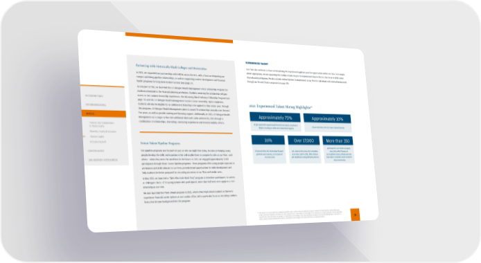 Partnering with Historically Black Colleges and Universities In 2021, we expanded our partnerships with HBCUs across the U.S., with a focus on deepening our campus and hiring pipeline relationships, as well as supporting student development and financial health programs for long-term student success (see page 37). As one part of this, we launched the J.P. Morgan Wealth Management HBCU Scholarship Program for students interested in the financial planning profession. Students receiving the scholarship will gain access to two summer internship experiences: the Advancing Black Pathways Fellowship Program (see page 37) and the J.P. Morgan Wealth Management Service Center Internship. Upon completion, students will also be eligible for an additional scholarship to be applied to their senior year. Through this program, J.P. Morgan Wealth Management plans to award 75 scholarships annually over the next five years, as well as provide training and licensing support. Additionally, in 2021, J.P. Morgan Wealth Management set a target to hire 300 additional Black and Latino advisors by 2025 through a combination of scholarships, internships, mentoring experiences and internal mobility efforts. EXPERIENCED TALENT Our Firm also continues to focus on broadening the experienced applicant pool for opportunities within our Firm. For example, where appropriate, we are expanding the number of jobs we post for experienced hires in the U.S. that focus on skills rather than educational degrees. We also actively reduce barriers to employment at our Firm for individuals with criminal backgrounds through our Second Chance program (see page 39). 22 Information on EEO race/ethnicity categories, gender, LGBT+, veteran status and disability status is based on self-identification and self-disclosure. Unless otherwise indicated, information on EEO race/ethnicity is presented as a percentage of the respective U.S.-based population who self-identified race/ethnicity and information on gender is presented as a percentage of the respective global population who self-identified gender; information on LGBT+, veteran status and disability status is presented as a percentage of the respective total U.S.-based population. Future Talent Pipeline Programs Our pipeline programs are focused not just on who we might hire today, but also on helping young people develop the skills and experience that will enable them to compete for jobs at our Firm – and others – when they enter the workforce in the future. In 2021, we engaged approximately 7,400 participants through these Future Pipeline programs. These programs offer young people exposure to professions and skills relevant to our Firm, provide broad opportunities for skills development and help students be better prepared for recruiting processes at our Firm and similar ones. In May 2021, we launched a “Girls Who Code Work Prep” program to introduce participants to careers at JPMorgan Chase. Of 50 young women who participated, more than half went on to apply to a 2022 internship at our Firm. We also launched the Think Ahead program in 2021, which offers high school students a chance to experience financial career options at our London office, with a particular focus on recruiting students from a low-income background into the program. 2021 Experienced Talent Hiring Highlights 22 31 INTRODUCTION ENVIRONMENTAL SOCIAL Feature: Our Commitment to Racial Equity Diversity, Equity & Inclusion Human Capital Inclusive Growth GOVERNANCE ESG REPORT APPENDICES Approximately 75% of jobs posted for experienced hires did not require a bachelor’s degree, focusing on skills over educational degrees Over 17,000 U.S. veteran hires since 2011, including more than 1,200 in 2021, 58% of whom self-identified as being ethnically diverse Approximately 10% of our new hires in the U.S. have criminal histories 16% of external hires for technology-focused positions were women, an increase of 5% from 2020 More than 350 participants in our ReEntry program since 2013, which focuses on accomplished career professionals who have taken a voluntary career break for two or more years