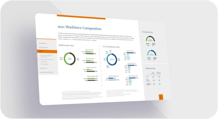Promotional Data Global Gender Data U.S. Race/Ethnicity Data Men 51% Women 49% White 46% Hispanic 20% Asian 17% Black 14% Other 14 3% TOTAL EMPLOYEES 13 TOTAL EMPLOYEES 15 60% Men 40% Women BOARD OF DIRECTORS 15 BOARD OF DIRECTORS 13 0% 10% Black Other 14 0% Asian 0% Hispanic 90% White OPERATING COMMITTEE 13 0% 0% 5% 11% Black Other 14 Asian Hispanic White 84% SENIOR LEVEL EMPLOYEES , 13 12 5% 1% 11% 6% 77% Black Other 14 Asian Hispanic White 63% Men 37% Women OPERATING COMMITTEE 15 74% Men 26% Women SENIOR LEVEL EMPLOYEES , 15 12 Men Women CAMPUS & INTERNSHIP CLASS 19 52% 48% CAMPUS & INTERNSHIP CLASS 17 37% 63% White Ethnic 18 Additional Data TOTAL EMPLOYEES LGBT+ 16 4% 2% People with disabilities 16 4% 2% Military veterans 16 3% 2% SENIOR LEVEL EMPLOYEES 12 Women 39% Men 61% GLOBAL PROMOTIONS , 20 19 Ethnic 18 47% White 53% U.S. PROMOTIONS , 20 17 12 Senior level employees represents employees with the titles of Managing Director and above. 13 Based on EEO metrics. Presented as a percentage of the respective populations who self-identified race/ethnicity: 96% and 95% of the Firm’s total U.S.-based employees and U.S.-based senior level employees, respectively, and all members of the Operating Committee and the Board of Directors. Information for the Operating Committee includes two members who are based outside of the U.S. 14 Other includes American Indian or Alaskan Native, Native Hawaiian or Other Pacific Islander, and two or more races/ethnicities. 15 Presented as a percentage of the respective populations who self-identified gender: 99% of each of the Firm’s total global employees and global senior level employees, and all members of the Operating Committee and the Board of Directors. 2021 Workforce Composition In connection with its diversity initiatives, the Firm periodically requests that its employees and Board members self-identify based on specified diversity categories. The following presents information on self-identifications as of December 31, 2021. The information according to Equal Employment Opportunity (“EEO”) race/ethnicity categories and gender is based on U.S. and global employees (including campus and internship class) respectively, who self-identified. Race/ethnicity and gender information reflects all members of the Operating Committee and the Board of Directors. Information on LGBT+, veteran, and disability statuses is based on U.S. employees. 16 Presented as a percentage of total U.S.-based employees and total U.S.-based senior level employees, respectively. 17 Based on EEO metrics. Presented as a percentage of the respective U.S.-based populations who self-identified race/ethnicity. 18 Ethnic is defined as all EEO classifications other than White. 19 Presented as a percentage of the respective global populations who self-identified gender. 20 Represents employees with the titles of Vice President and above. 26 INTRODUCTION ENVIRONMENTAL SOCIAL Feature: Our Commitment to Racial Equity Diversity, Equity & Inclusion Human Capital Inclusive Growth GOVERNANCE ESG REPORT APPENDICES