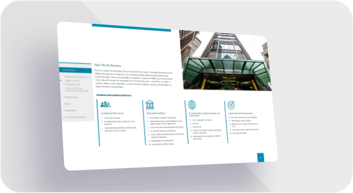 Exceptional client service 1. Focus on the customer 2. Be field and client driven and operate at the local level 3. Build world-class franchises, investing for the long term, to serve our clients Operational excellence 4. Set the highest standards of performance 5. Demand financial rigor and risk discipline; We will always maintain a fortress balance sheet 6. Strive for the best internal governance and controls 7. Act and think like owners and partners 8. Strive to build and maintain the best, most efficient systems and operations 9. Be disciplined in everything we do 10. Execute with both skill and urgency A commitment to integrity, fairness and responsibility 11. Do not compromise our integrity 12. Face facts 13. Have fortitude 14. Foster an environment of respect, inclusiveness, humanity and humility 15. Help strengthen the communities in which we live and work A great team and winning culture 16. Hire, train and retain great, diverse employees 17. Build teamwork, loyalty and morale 18. Maintain an open, entrepreneurial meritocracy for all 19. Communicate honestly, clearly and consistently 20. Strive to be good leaders How We Do Business We strive to operate a thriving company that we can be proud of and to support a sustainable and inclusive economy. Fulfilling these goals rests on staying true to our core business principles: delivering exceptional client service, operational excellence, fairness and responsibility, a commitment to integrity and building a great team and winning culture. Doing all of this well is the underpinning of our Firm’s long-term success – and therefore of our ability to continue to deliver for all our stakeholders – customers and clients, employees, community, and shareholders. Our Business Principles are described below. JPMORGAN CHASE BUSINESS PRINCIPLES 4 INTRODUCTION Message from Our Chairman & CEO Company at a Glance Our Approach to ESG Feature: Our $2.5 Trillion Sustainable Development Target ENVIRONMENTAL SOCIAL GOVERNANCE ESG REPORT APPENDICES