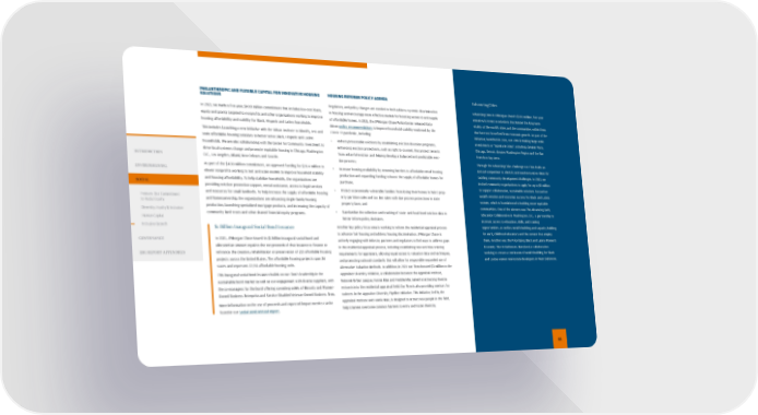 $1 Billion Inaugural Social Bond Issuance In 2021, JPMorgan Chase issued its $1 billion inaugural social bond and allocated an amount equal to the net proceeds of that issuance to finance or refinance the creation, rehabilitation or preservation of 223 affordable housing projects across the United States. The affordable housing projects span 36 states and represent 22,911 affordable housing units. This inaugural social bond issuance builds on our Firm’s leadership in the sustainable bond market as well as our engagement with diverse suppliers, with the co-managers for the bond offering consisting solely of Minority and Women- Owned Business Enterprise and Service-Disabled Veteran-Owned Business firms. More information on the use of proceeds and expected impact metrics can be found in our Social Bond Annual Report . PHILANTHROPIC AND FLEXIBLE CAPITAL FOR INNOVATIVE HOUSING SOLUTIONS In 2021, we made a five-year, $400 million commitment that includes low-cost loans, equity and grants targeted to nonprofits and other organizations working to improve housing affordability and stability for Black, Hispanic and Latino households. This includes launching a new initiative with the Urban Institute to identify, test and scale affordable housing solutions to better serve Black, Hispanic and Latino households. We are also collaborating with the Center for Community Investment to drive local systems change and promote equitable housing in Chicago, Washington D.C., Los Angeles, Miami, New Orleans and Seattle. As part of the $400 million commitment, we approved funding for $20.4 million to eleven nonprofits working to test and scale models to improve household stability and housing affordability. To help stabilize households, the organizations are providing eviction prevention support, rental assistance, access to legal services and resources for small landlords. To help increase the supply of affordable housing and homeownership, the organizations are advancing single-family housing production, launching specialized mortgage products, and increasing the capacity of community land trusts and other shared financial equity programs. HOUSING REFORMS POLICY AGENDA Regulatory and policy changes are needed to both address systemic discrimination in housing and encourage more effective models for boosting access to and supply of affordable homes. In 2021, the JPMorgan Chase Policy Center released data- driven policy recommendations to improve household stability weakened by the COVID-19 pandemic, including: • Reduce preventable evictions by establishing eviction diversion programs, enhancing eviction protections, such as right to counsel, that protect tenants from unlawful eviction and helping develop a balanced and predictable evic - tion process; • Increase housing availability by removing barriers to affordable rental housing production and expanding funding to boost the supply of affordable homes for purchase; • Protect economically vulnerable families from losing their homes in heirs' prop - erty partition sales and tax lien sales with due process protections in state property laws; and • Standardize the collection and tracking of state- and local-level eviction data to better inform policy decisions. Another key policy focus area is working to reform the residential appraisal process to advance fair housing and address housing discrimination. JPMorgan Chase is actively engaging with industry partners and regulators to find ways to address gaps in the residential appraisal process, including establishing new anti-bias training requirements for appraisers, allowing equal access to valuation data and techniques, and promoting national standards that will allow for responsible expanded use of Alternative Valuation Methods. In addition, in 2021 our Firm donated $3 million to the Appraiser Diversity Initiative, a collaboration between the Appraisal Institute, National Urban League, Fannie Mae and Freddie Mac aimed at attracting diverse entrants into the residential appraisal field. Our Firm is also providing mentors for trainees in the Appraiser Diversity Pipeline Initiative. This initiative, led by the Appraisal Institute and Fannie Mae, is designed to attract new people in the field, help trainees overcome common barriers to entry and foster diversity. AdvancingCities AdvancingCities is JPMorgan Chase’s $500 million, five-year initiative to invest in solutions that bolster the long-term vitality of the world’s cities and the communities within them that have not benefited from economic growth. As part of the initiative, launched in 2018, our Firm is making large-scale investments in “signature cities”, including; Greater Paris, Chicago, Detroit, Greater Washington Region and the San Francisco Bay Area. Through the AdvancingCities Challenge our Firm holds an annual competition to identify and seed innovative ideas for tackling community development challenges. In 2021, we invited community organizations to apply for up to $5 million to support collaborative, sustainable solutions focused on wealth creation and economic success for Black and Latina women, which is foundational to building more equitable communities. One of the winners was The Advancing Early Education Collaborative in Washington, D.C., a partnership to increase access to education, skills, and training opportunities, as well as wealth building and capacity building for early childhood educators and the centers that employ them. Another was the Prioritizing Black and Latina Women’s Economic Rise in Baltimore, Maryland, a collaboration working to create a continuum of wealth building for Black and Latina women real estate developers in West Baltimore. 44 INTRODUCTION ENVIRONMENTAL SOCIAL Feature: Our Commitment to Racial Equity Diversity, Equity & Inclusion Human Capital Inclusive Growth GOVERNANCE ESG REPORT APPENDICES
